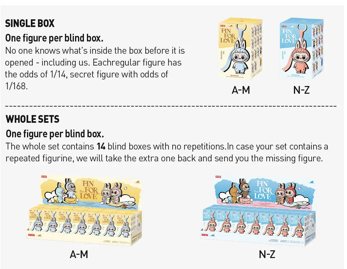 - The Pin for Love concept celebrates connection and little moments of affection, and here it arrives as mini Labubu pendants with designs coded from A to M. Each box keeps the surprise intact while the character’s toothy grin and tall ears deliver that mischievous look fans know by heart.