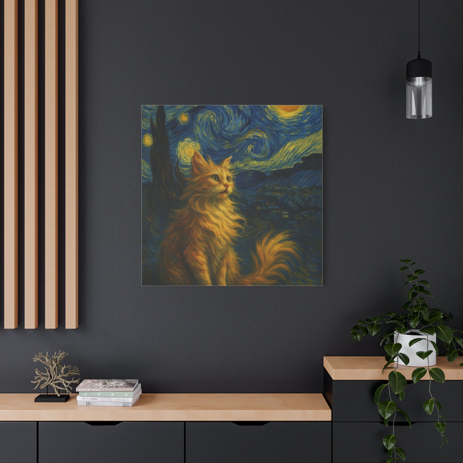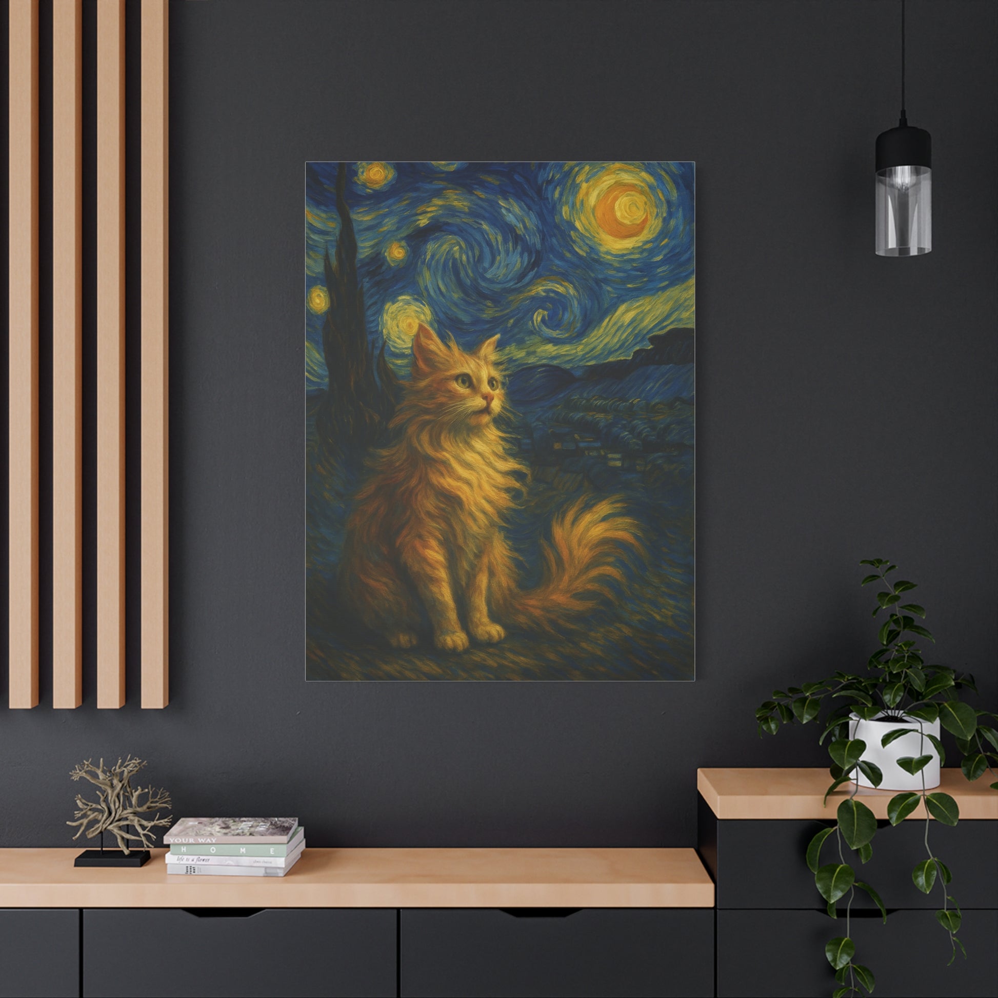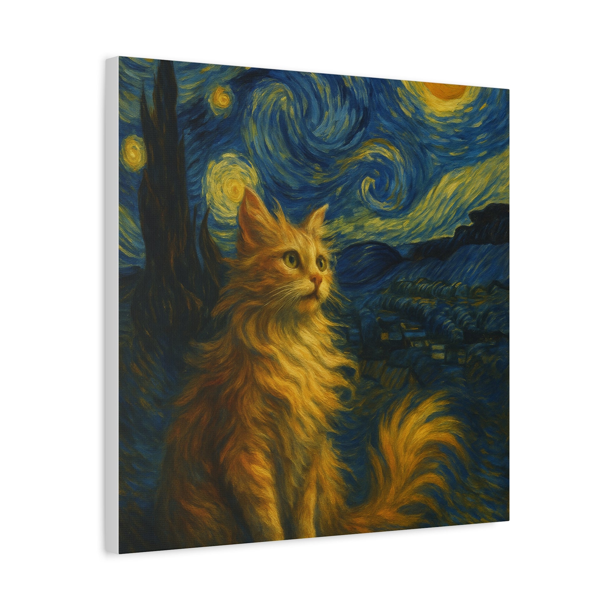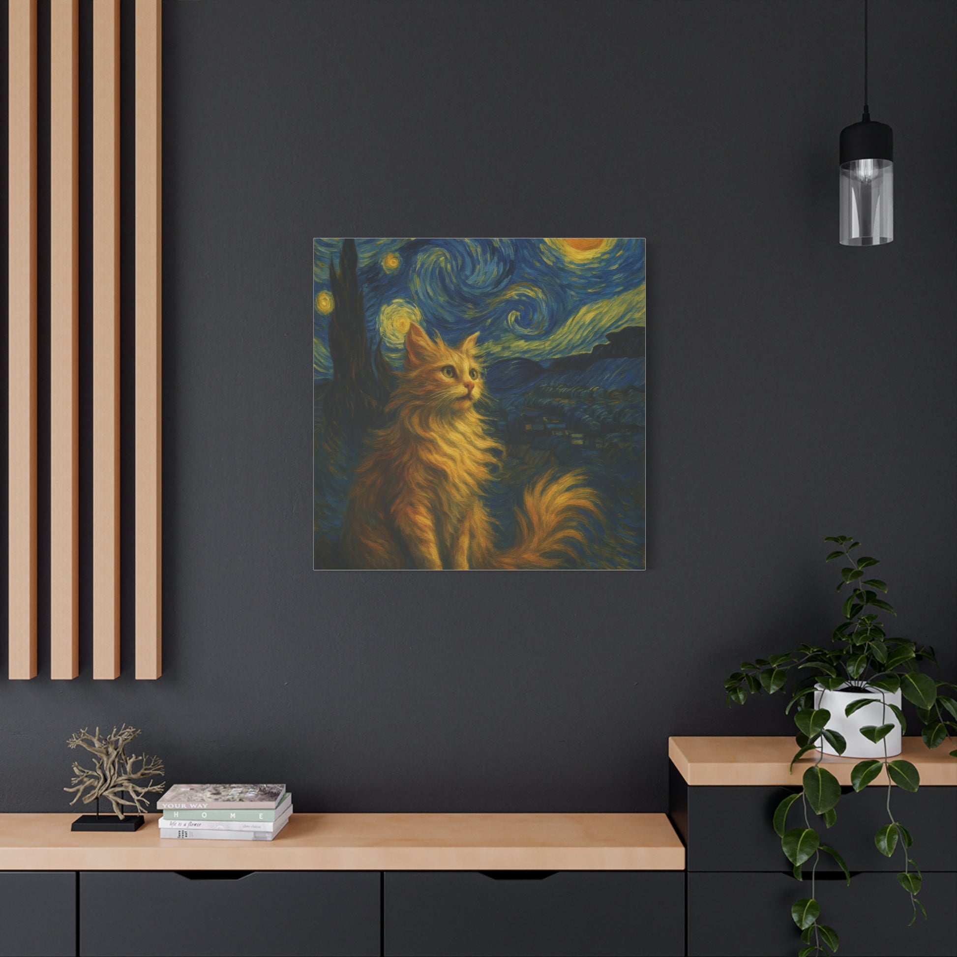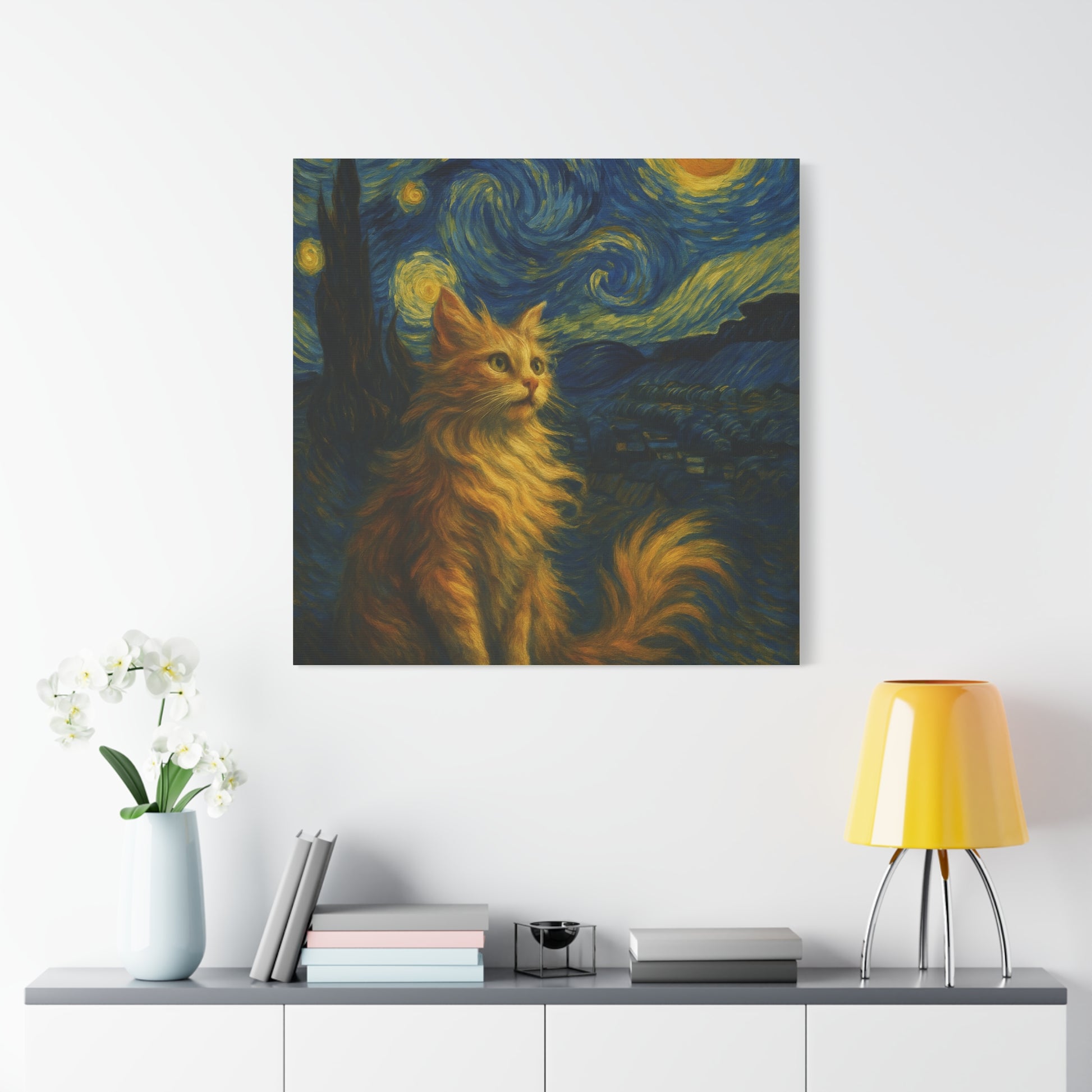 Vibrant canvas art print of a cat in a starry night, perfect for cat lovers looking to add a whimsical touch to their home decor. Ideal for those seeking a colorful and fun atmosphere in their living spaces, this canvas print is relevant for birthdays, Christmas, and housewarming gifts.