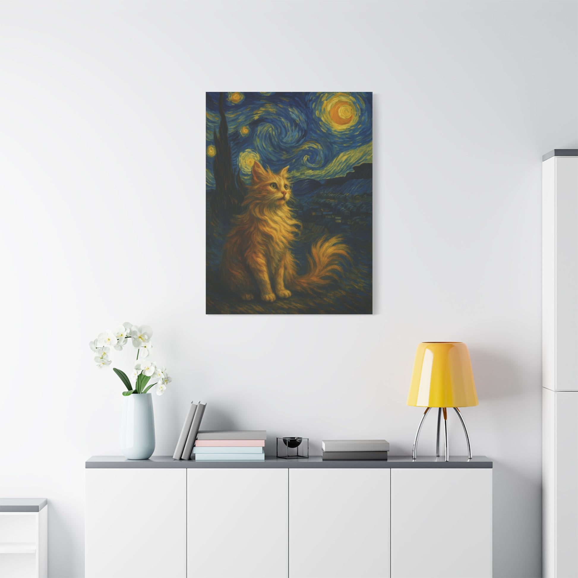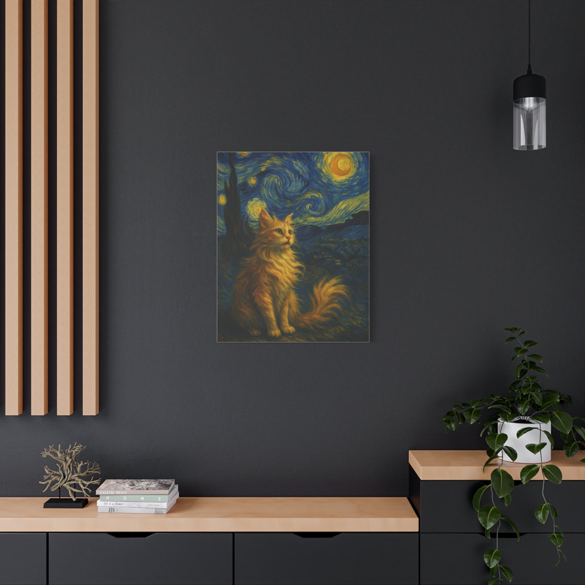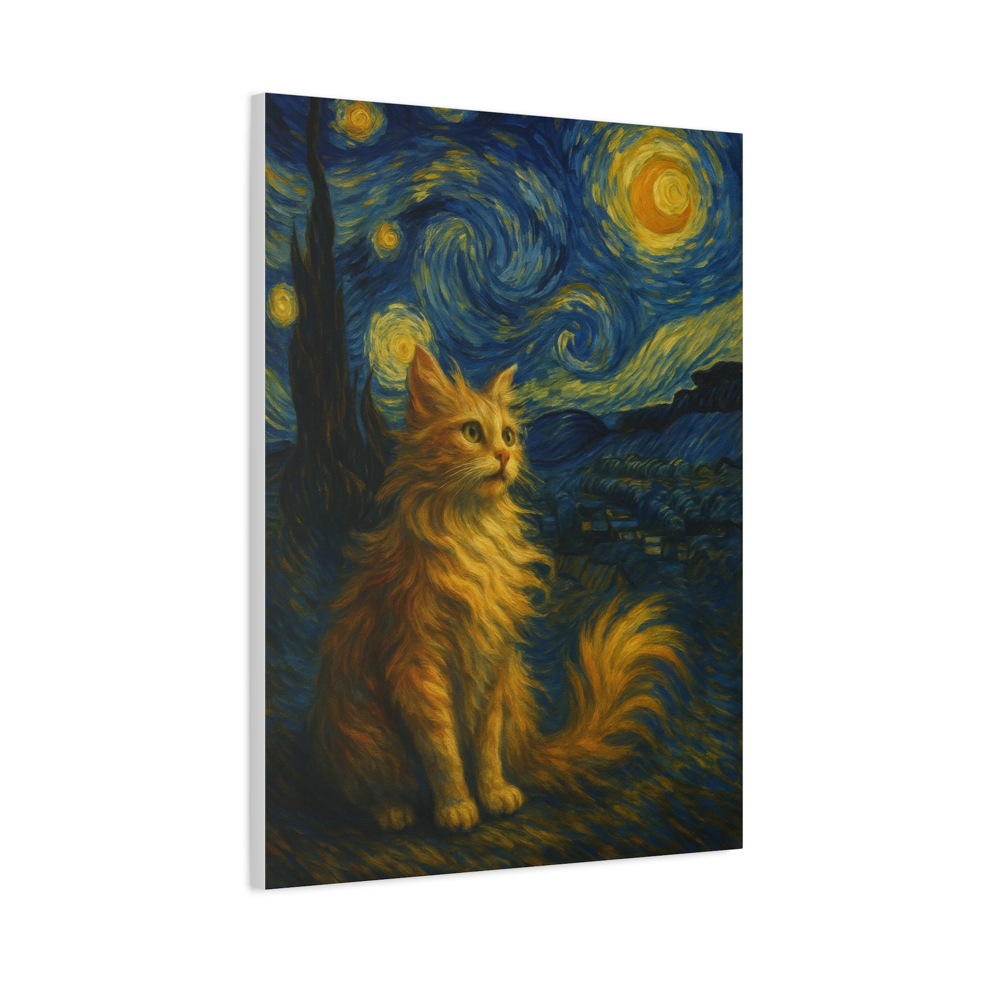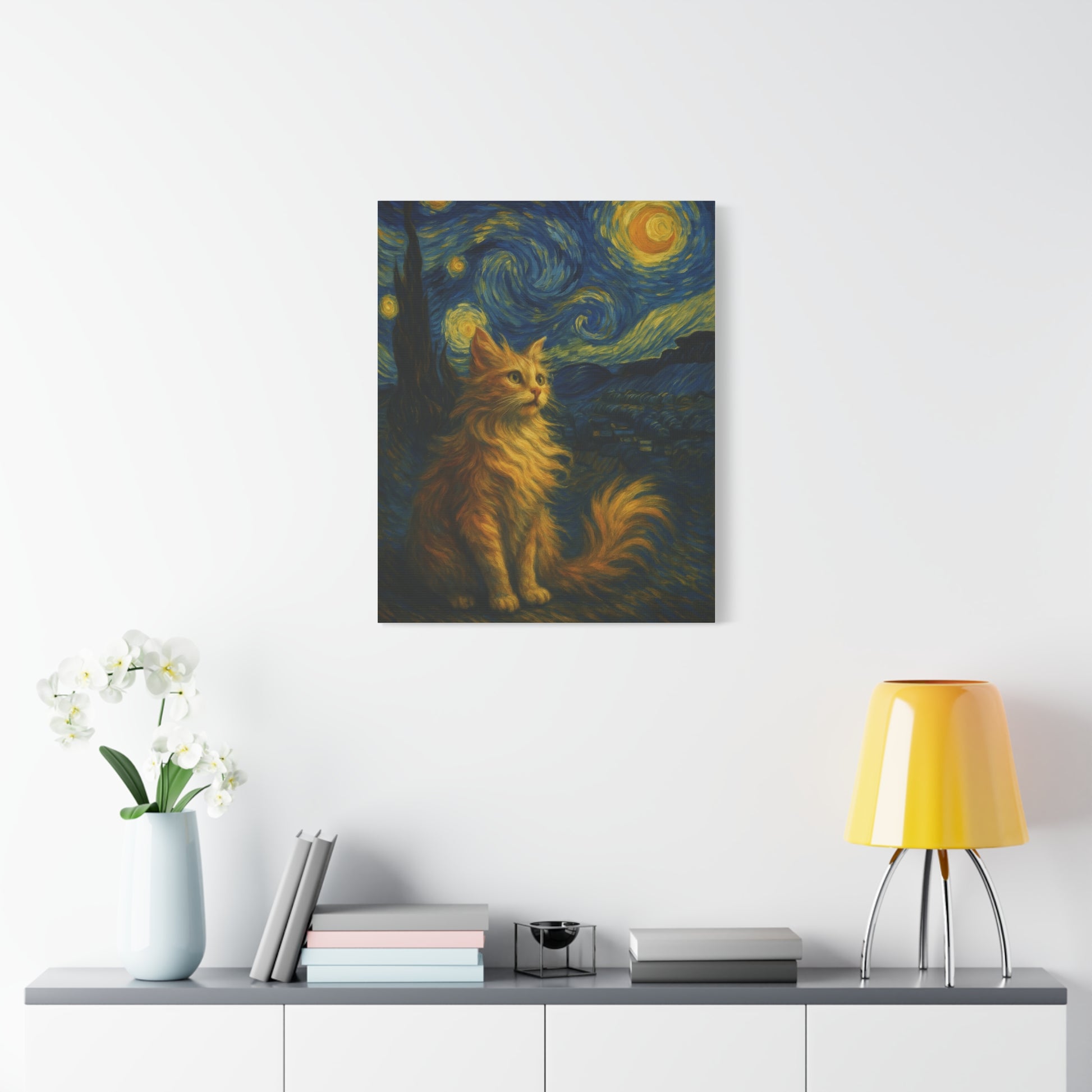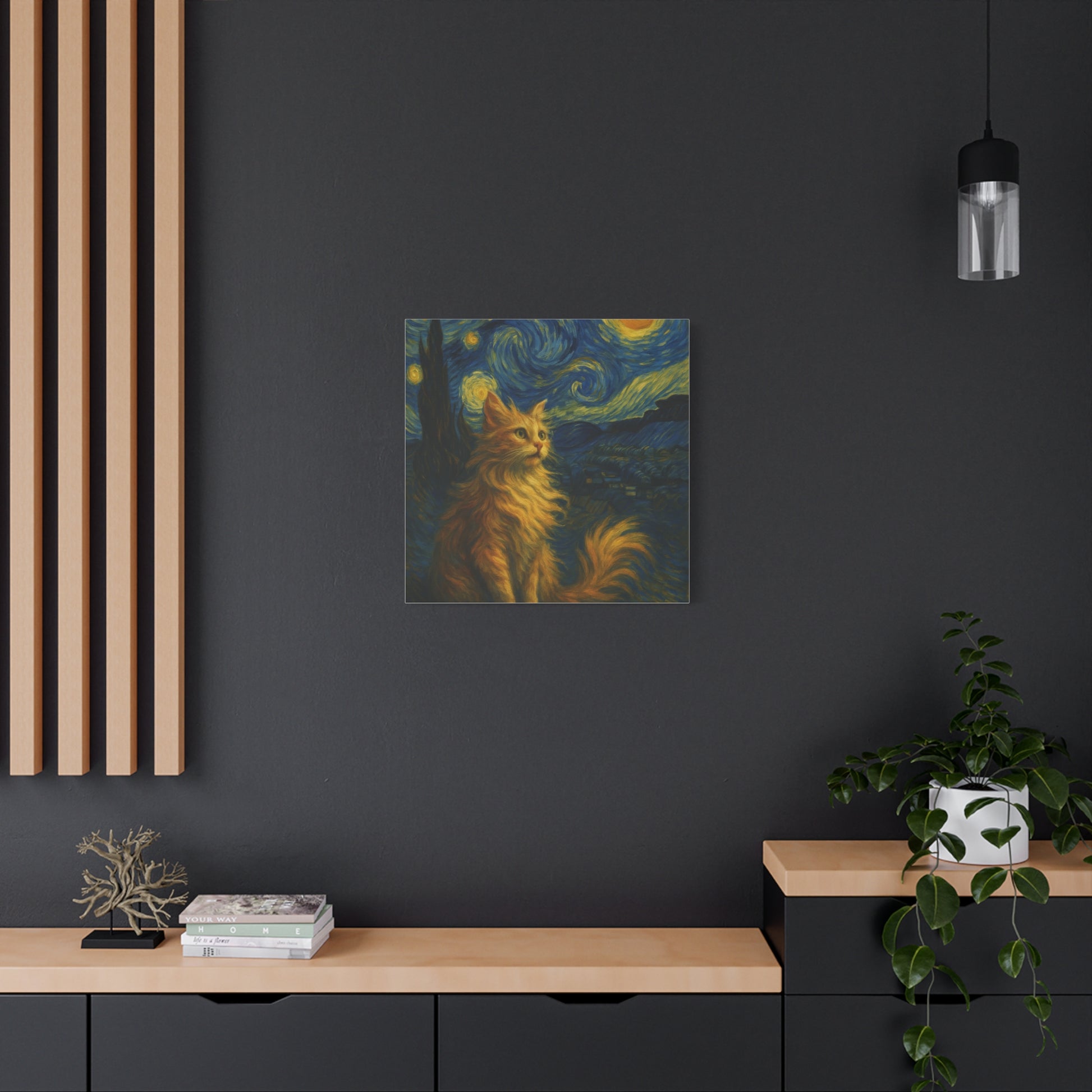 Vibrant canvas art print of a cat in a starry night, perfect for cat lovers looking to add a whimsical touch to their home decor. Ideal for those seeking a colorful and fun atmosphere in their living spaces, this canvas print is relevant for birthdays, Christmas, and housewarming gifts.