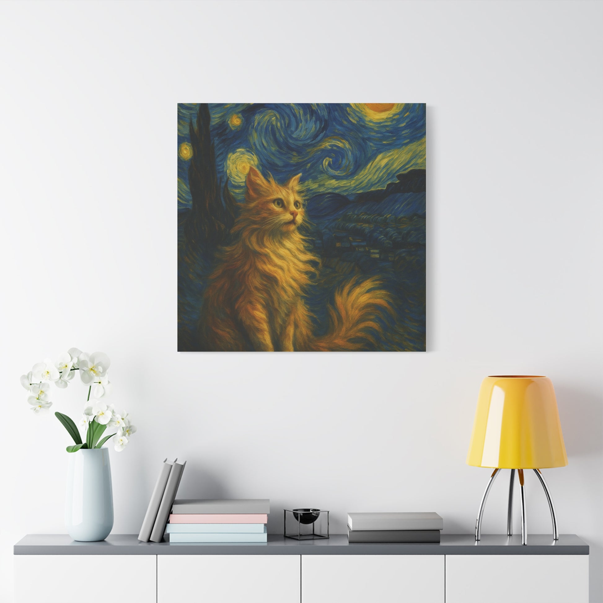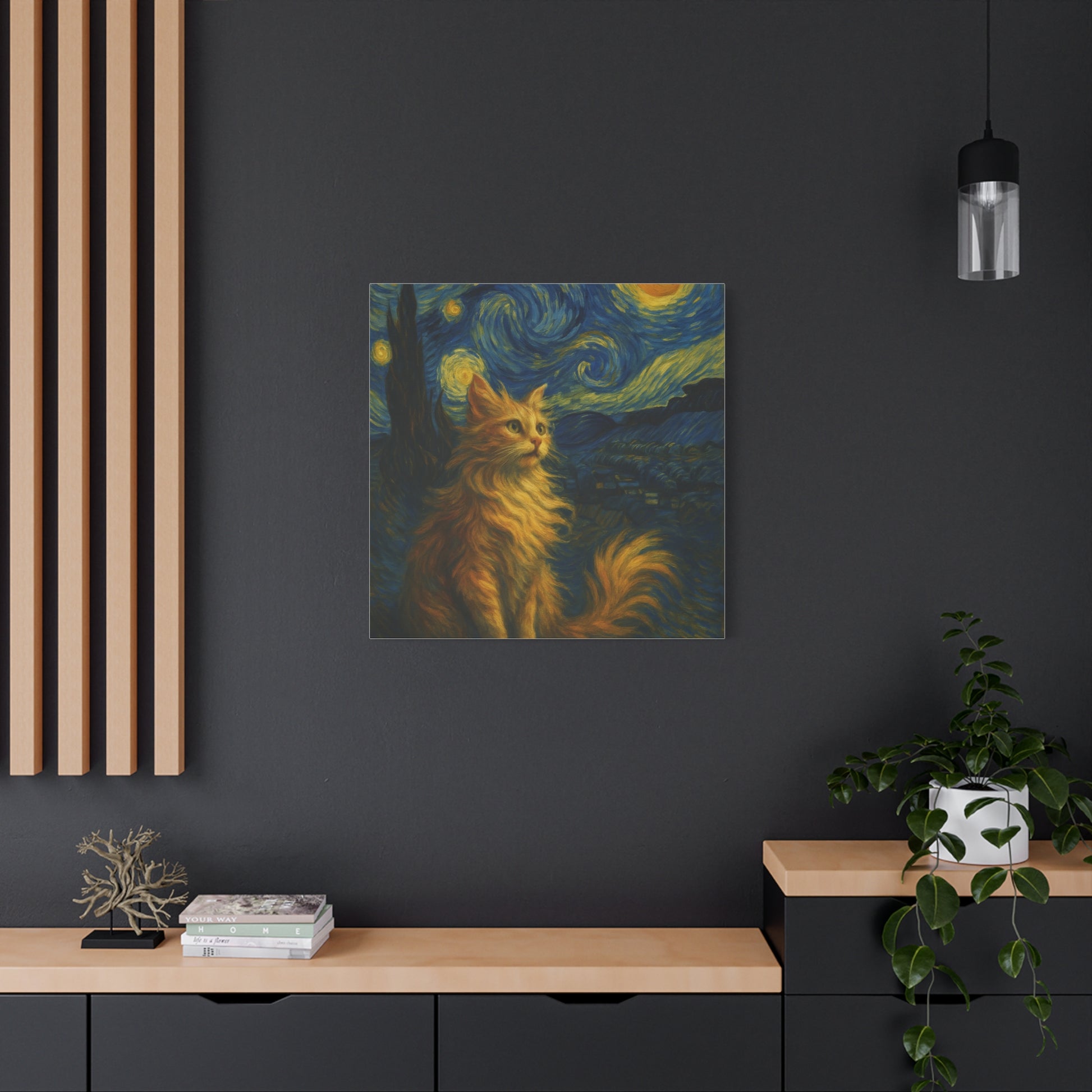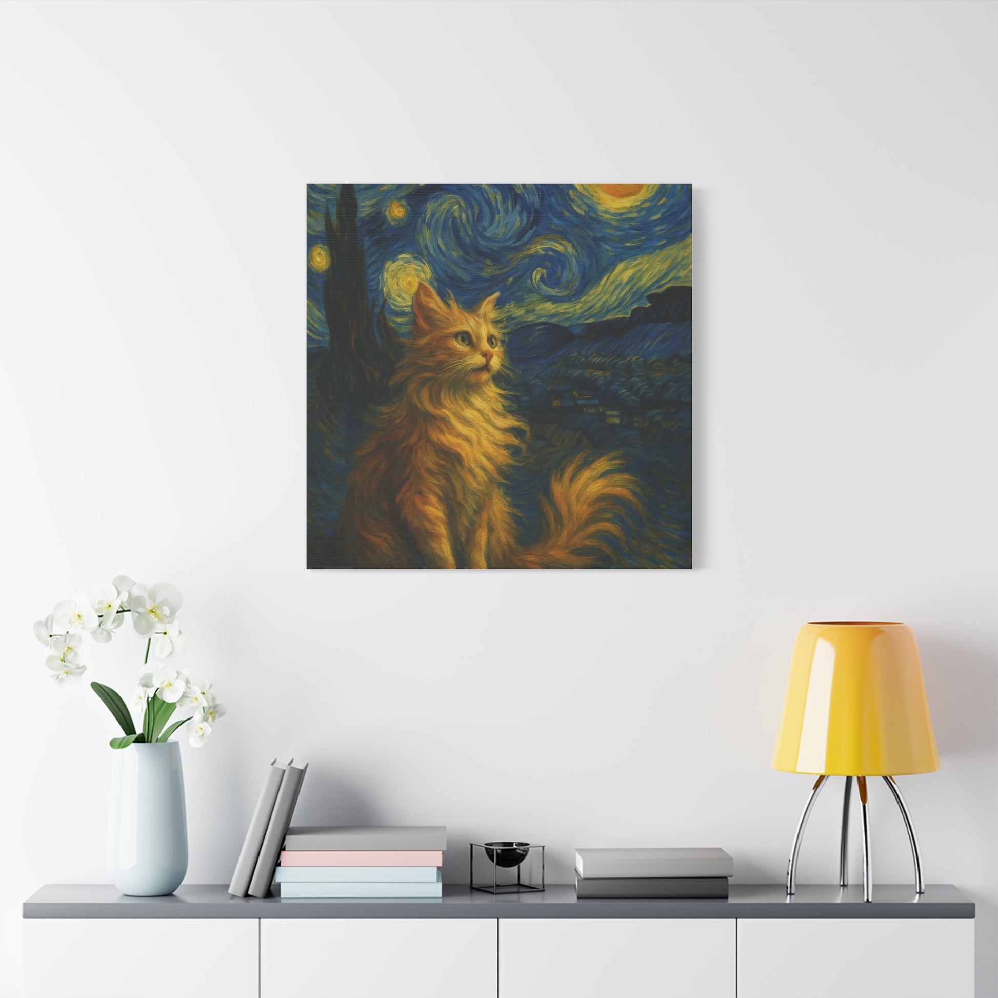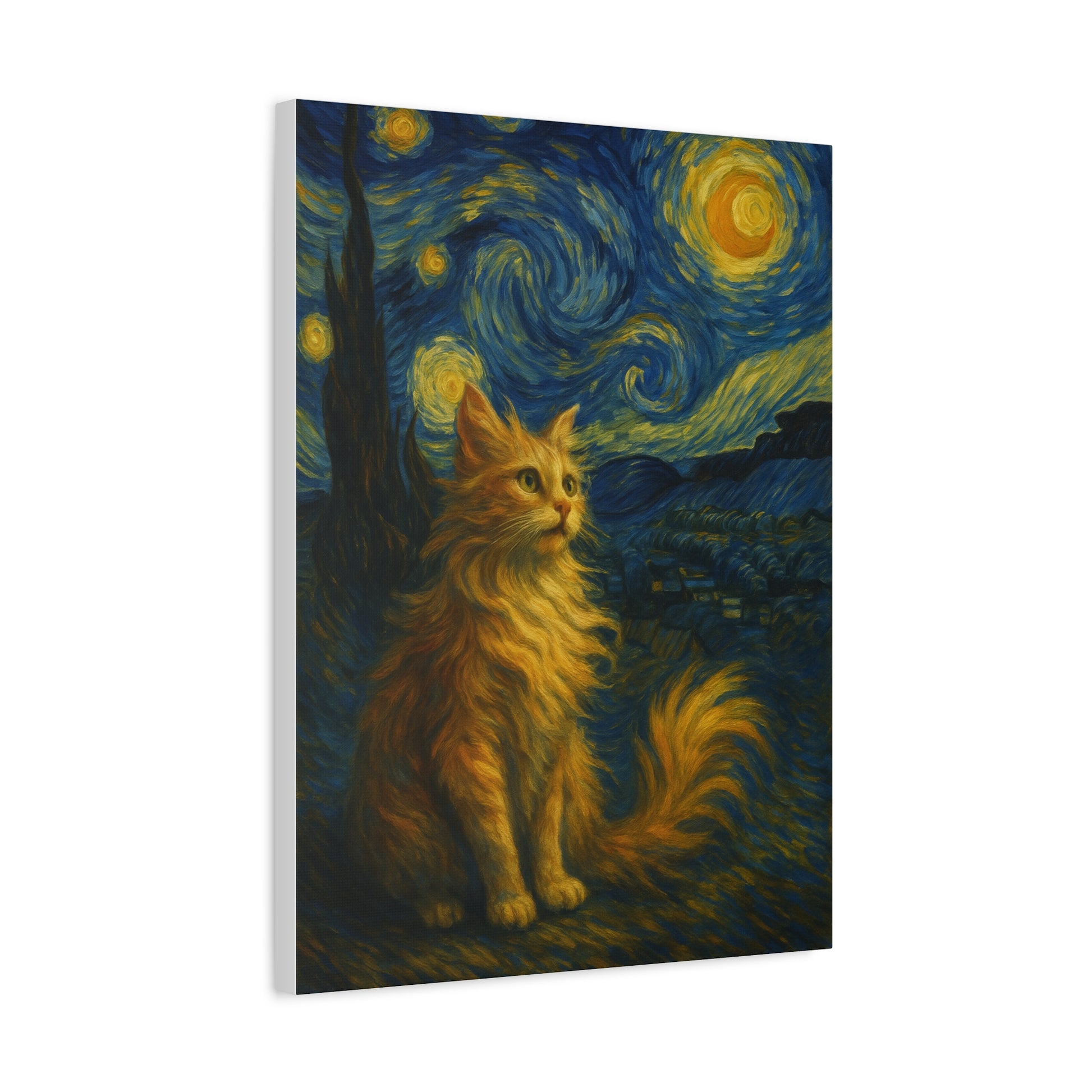 Vibrant canvas art print of a cat in a starry night, perfect for cat lovers looking to add a whimsical touch to their home decor. Ideal for those seeking a colorful and fun atmosphere in their living spaces, this canvas print is relevant for birthdays, Christmas, and housewarming gifts.