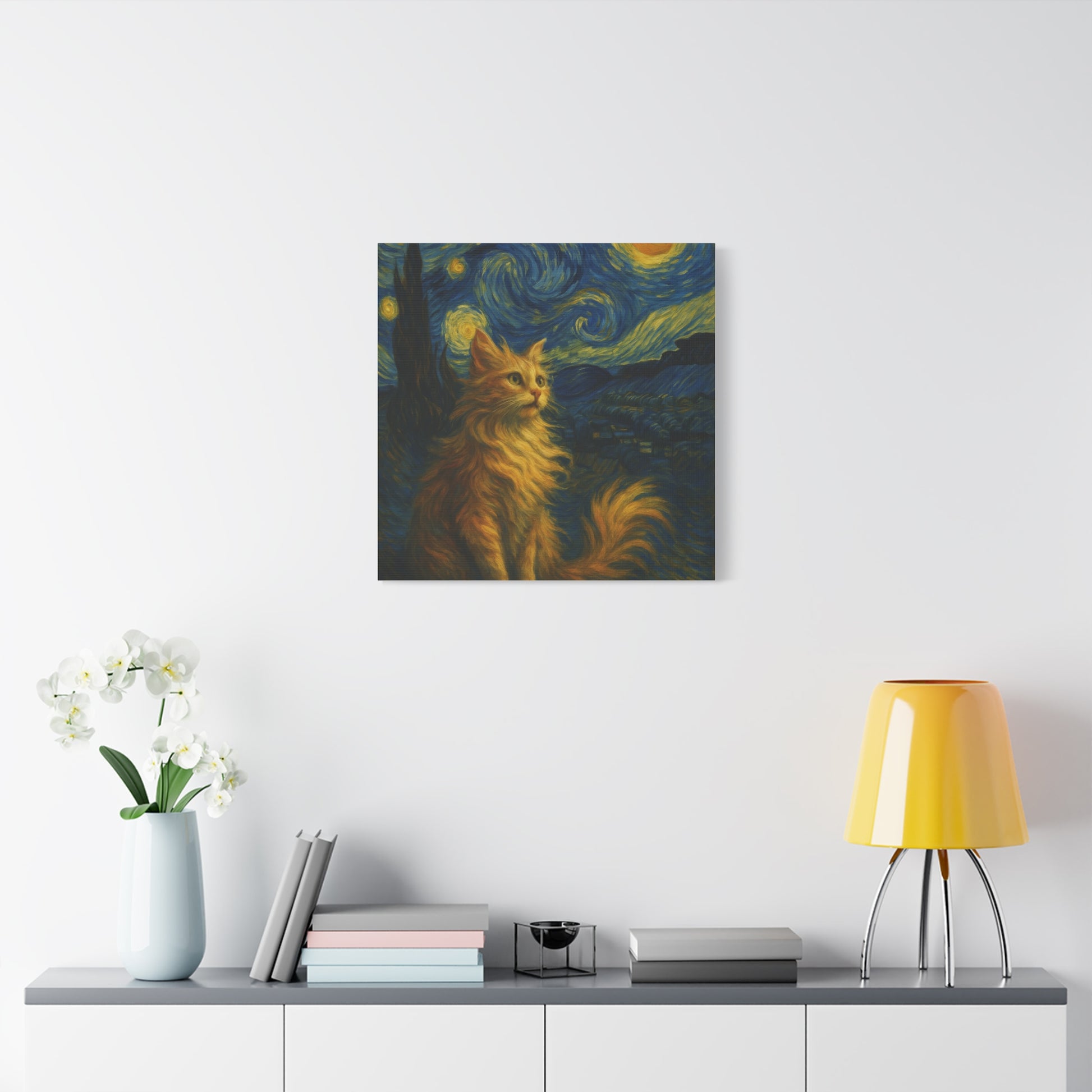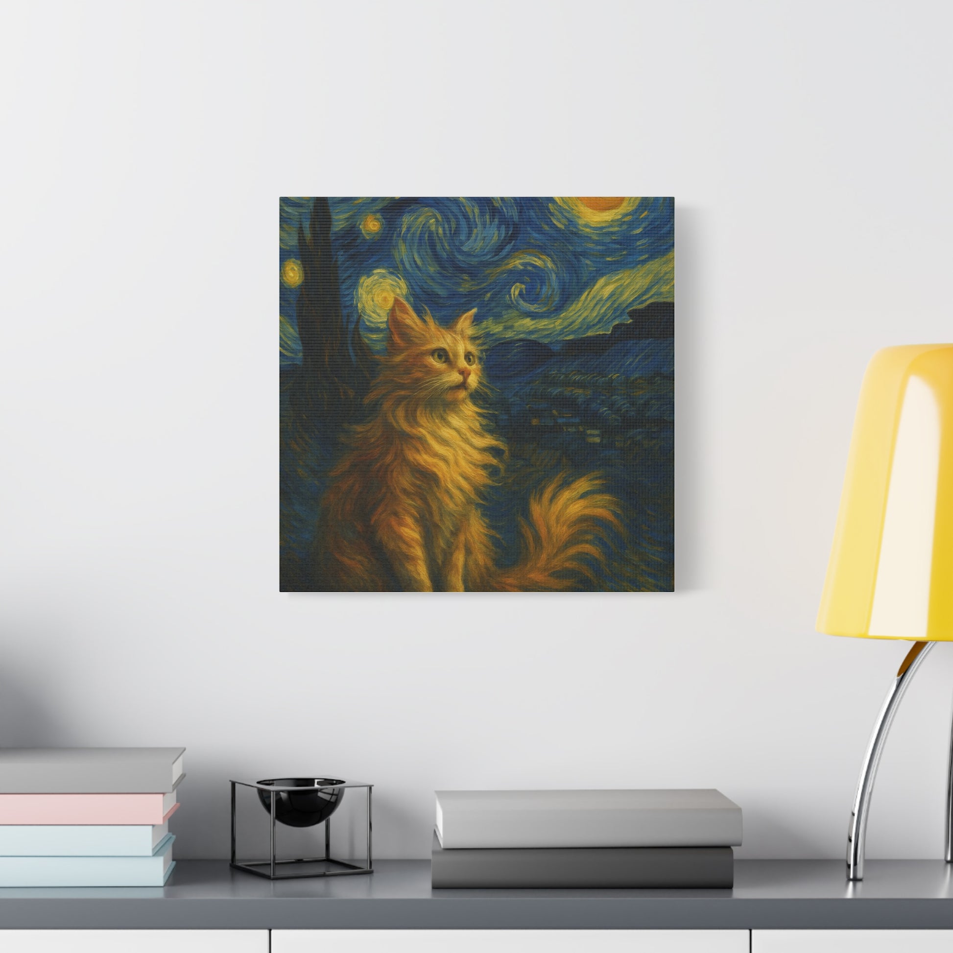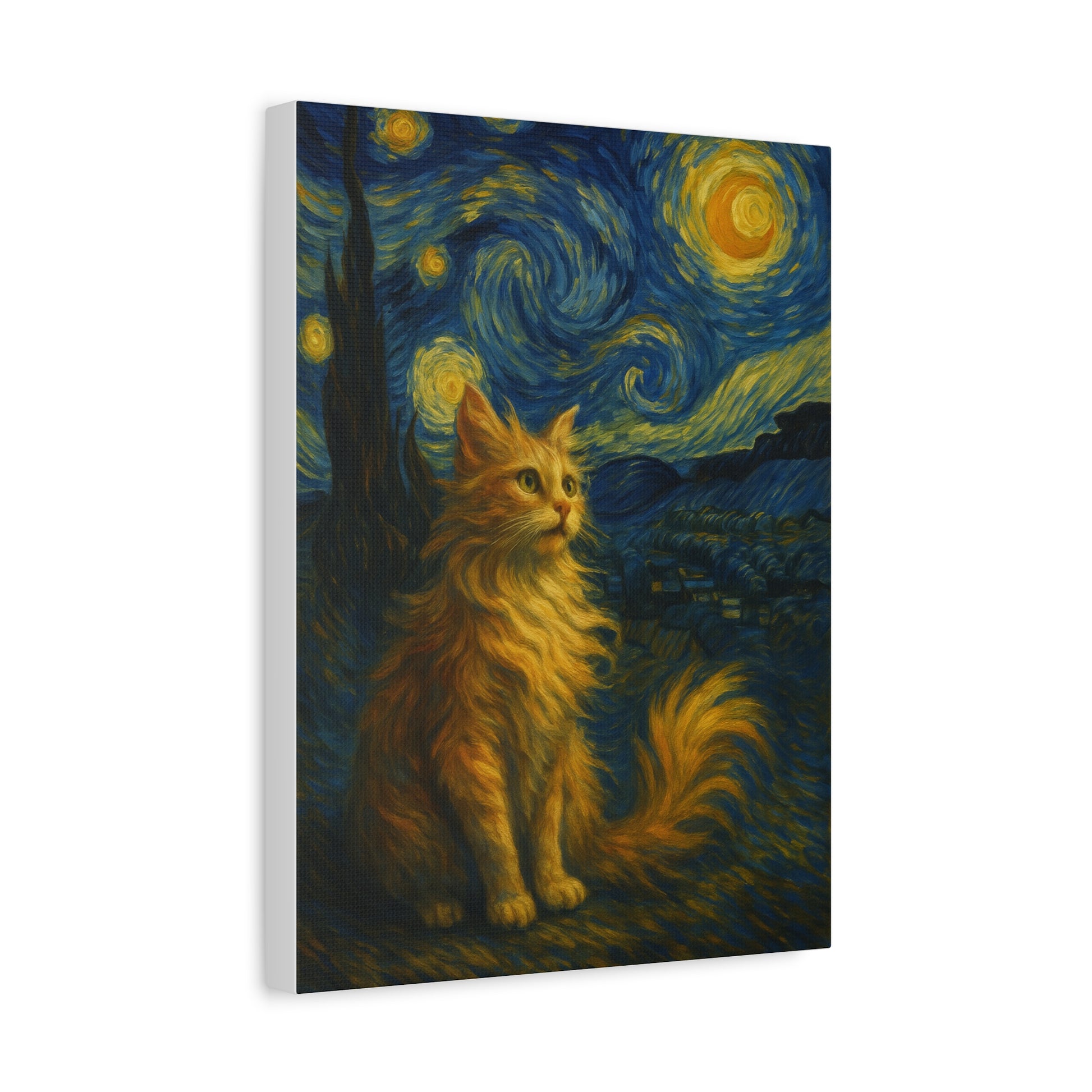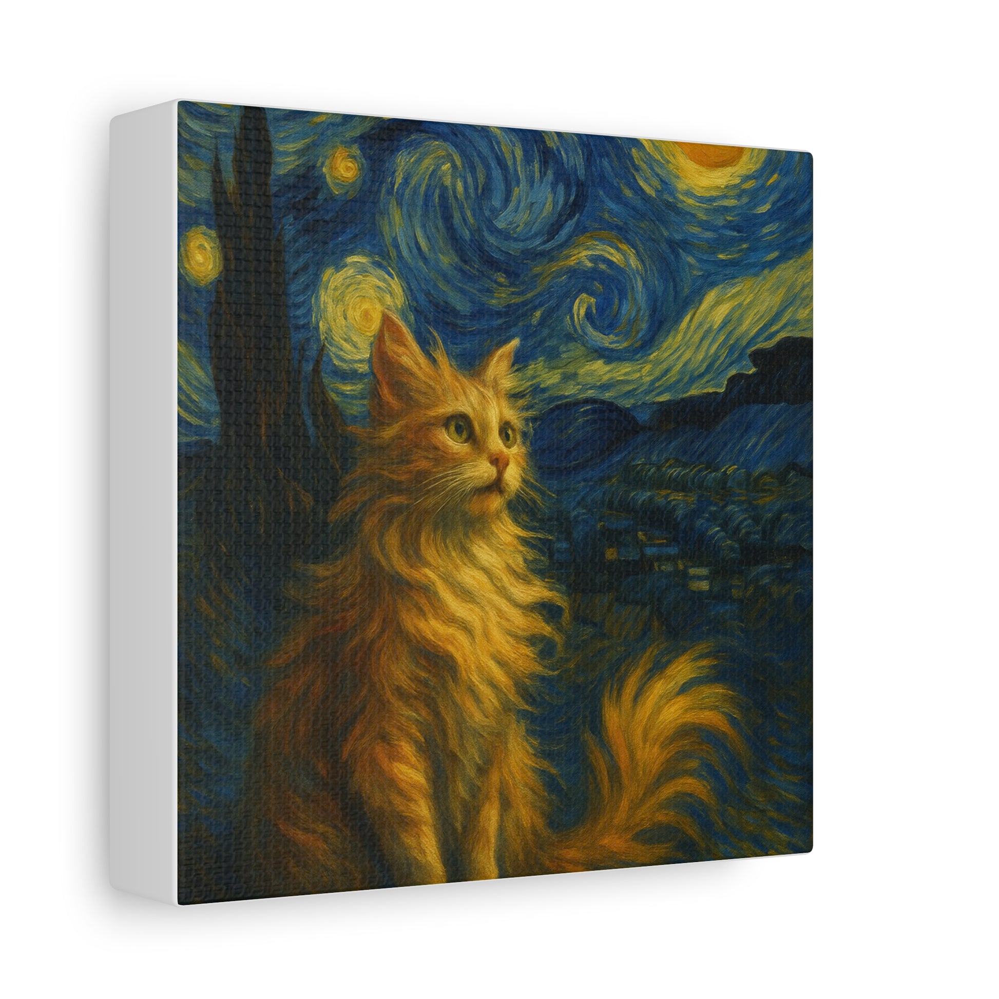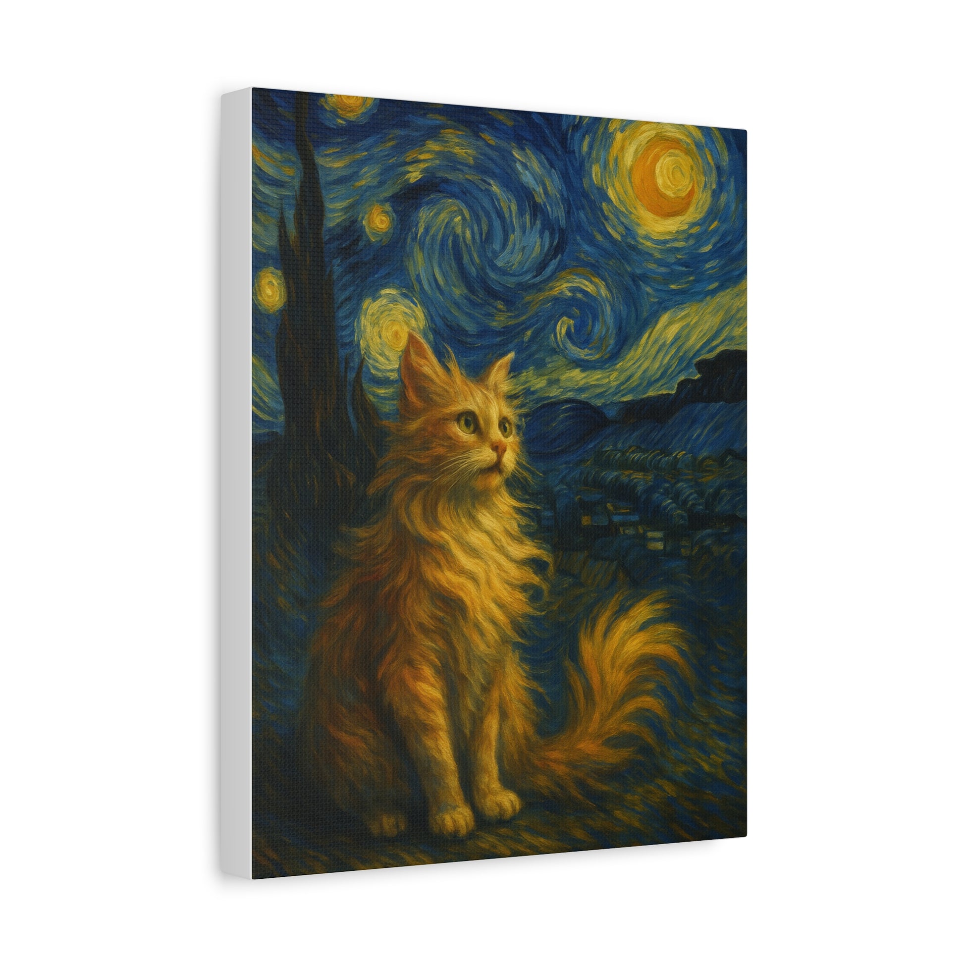 Vibrant canvas art print of a cat in a starry night, perfect for cat lovers looking to add a whimsical touch to their home decor. Ideal for those seeking a colorful and fun atmosphere in their living spaces, this canvas print is relevant for birthdays, Christmas, and housewarming gifts.