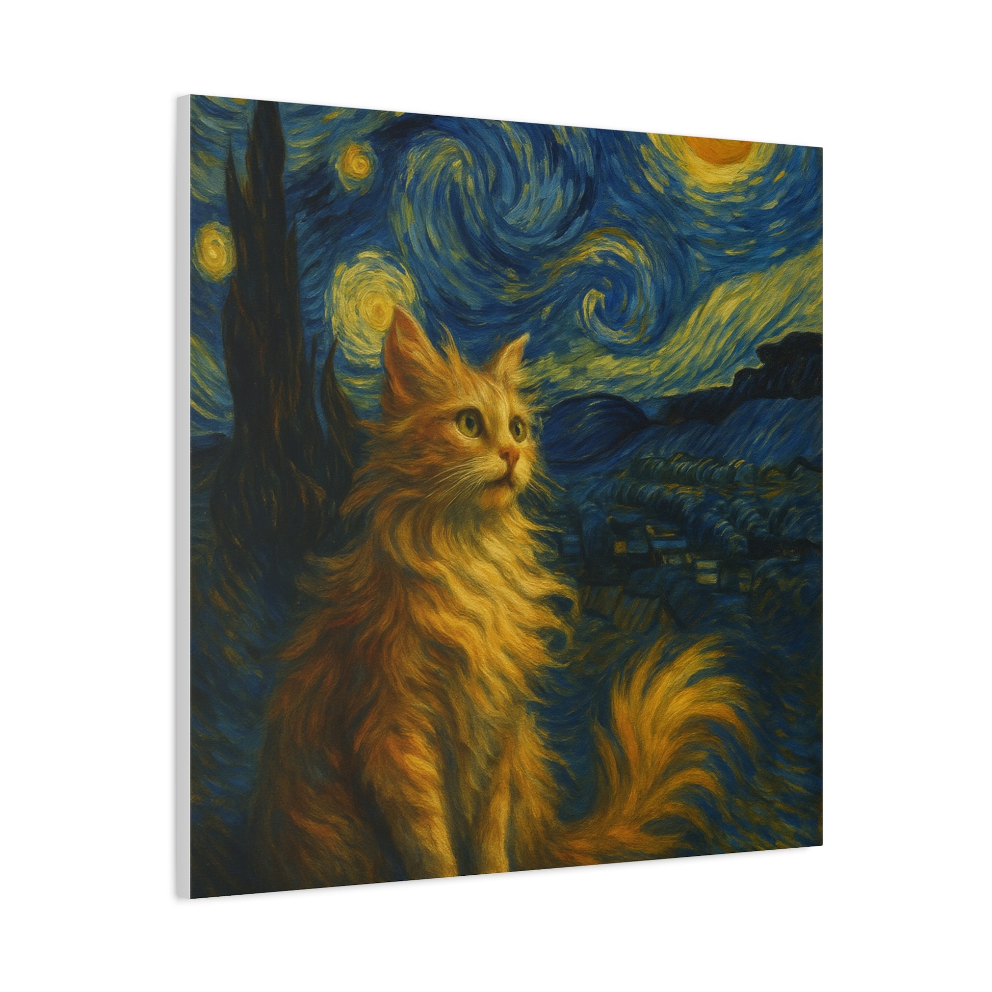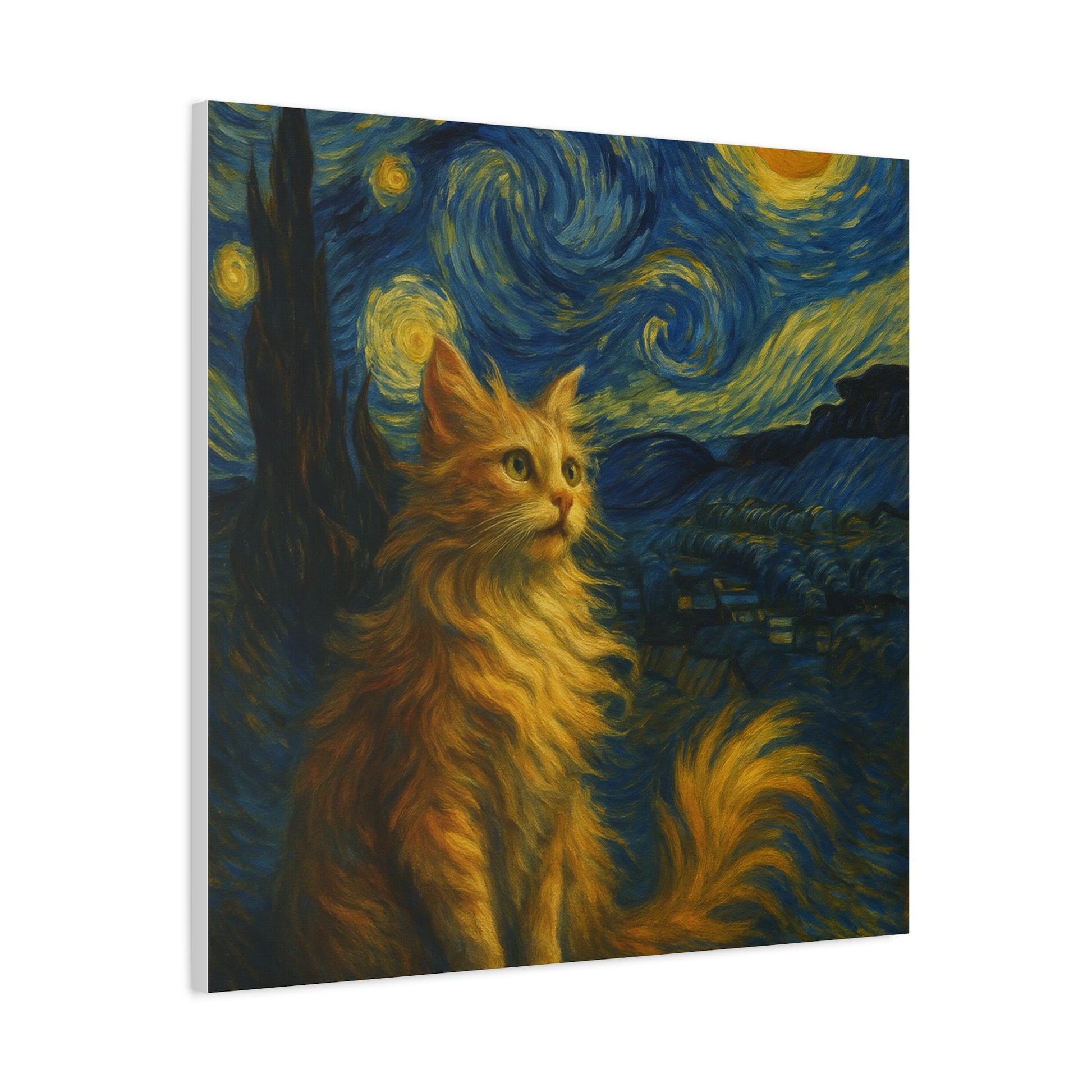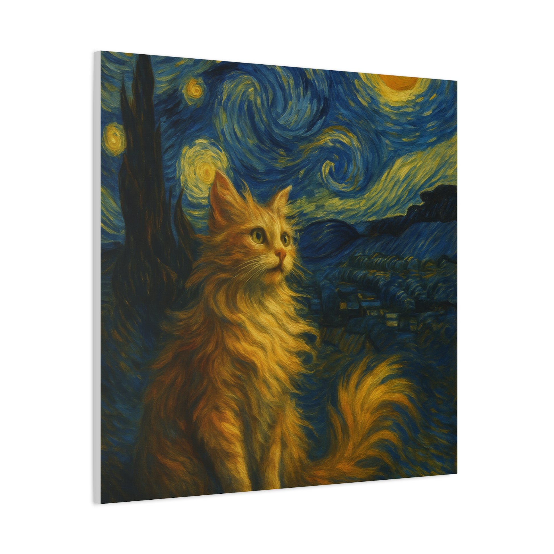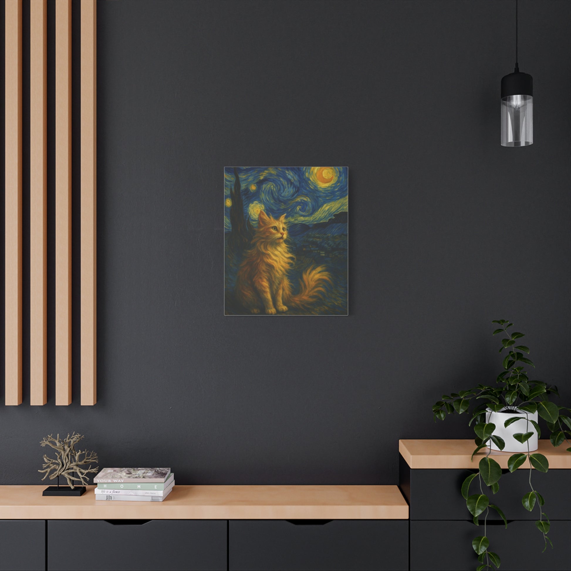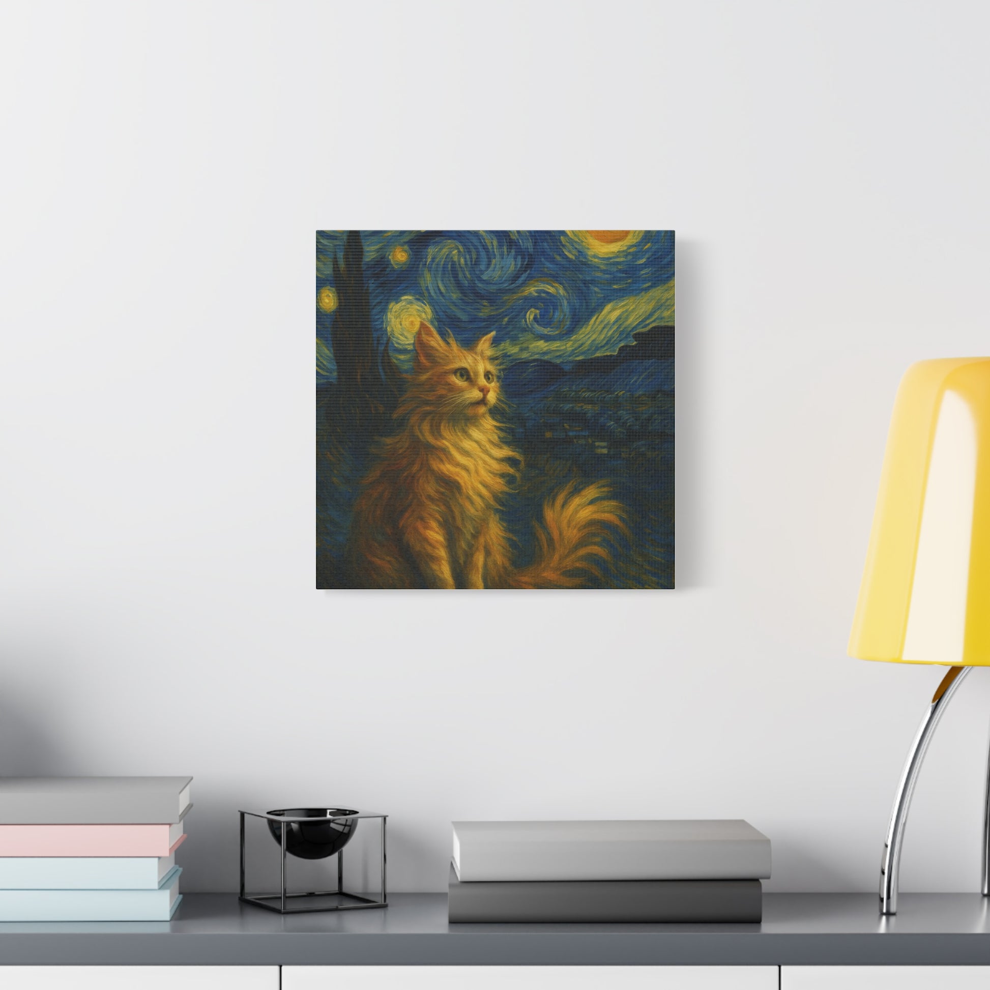 Vibrant canvas art print of a cat in a starry night, perfect for cat lovers looking to add a whimsical touch to their home decor. Ideal for those seeking a colorful and fun atmosphere in their living spaces, this canvas print is relevant for birthdays, Christmas, and housewarming gifts.