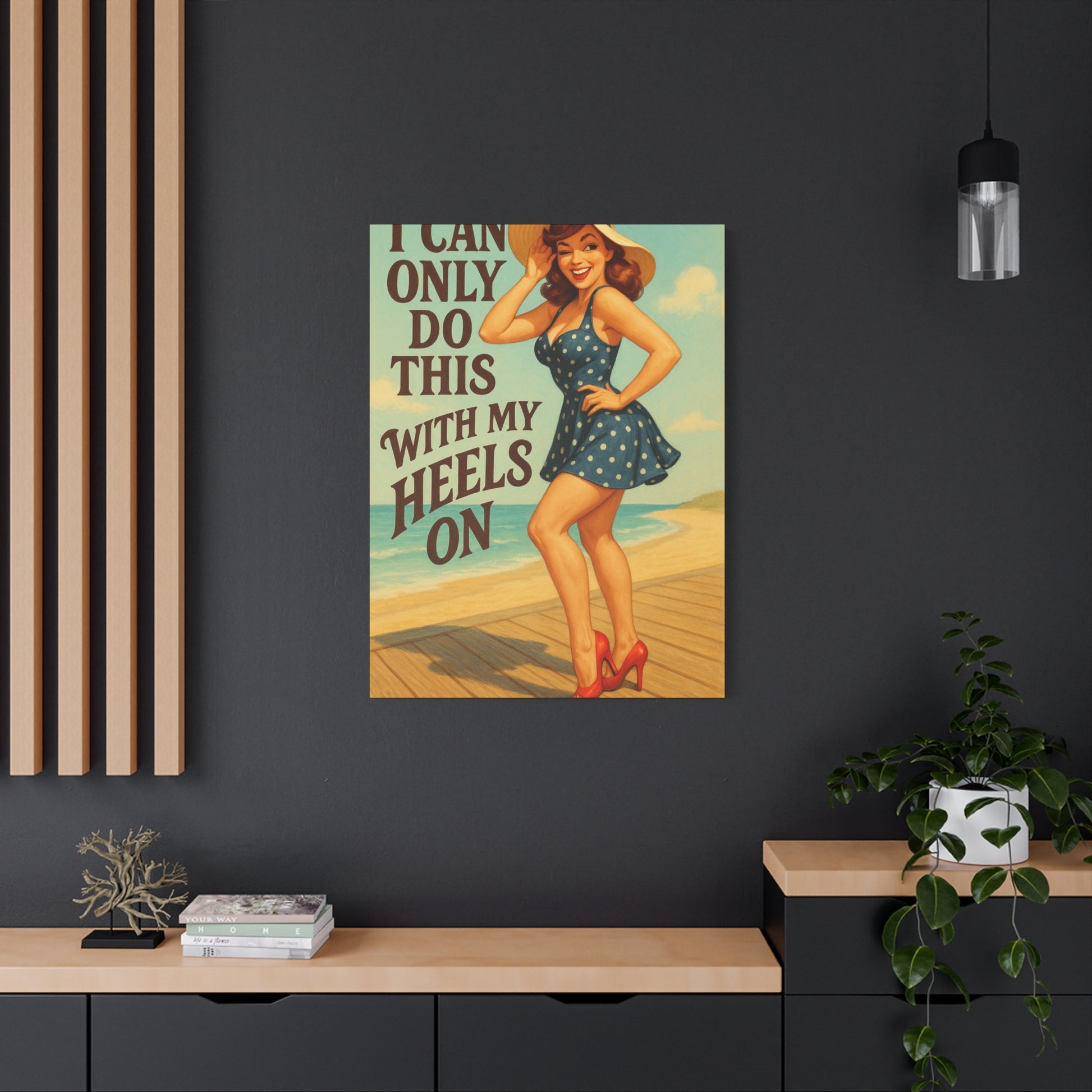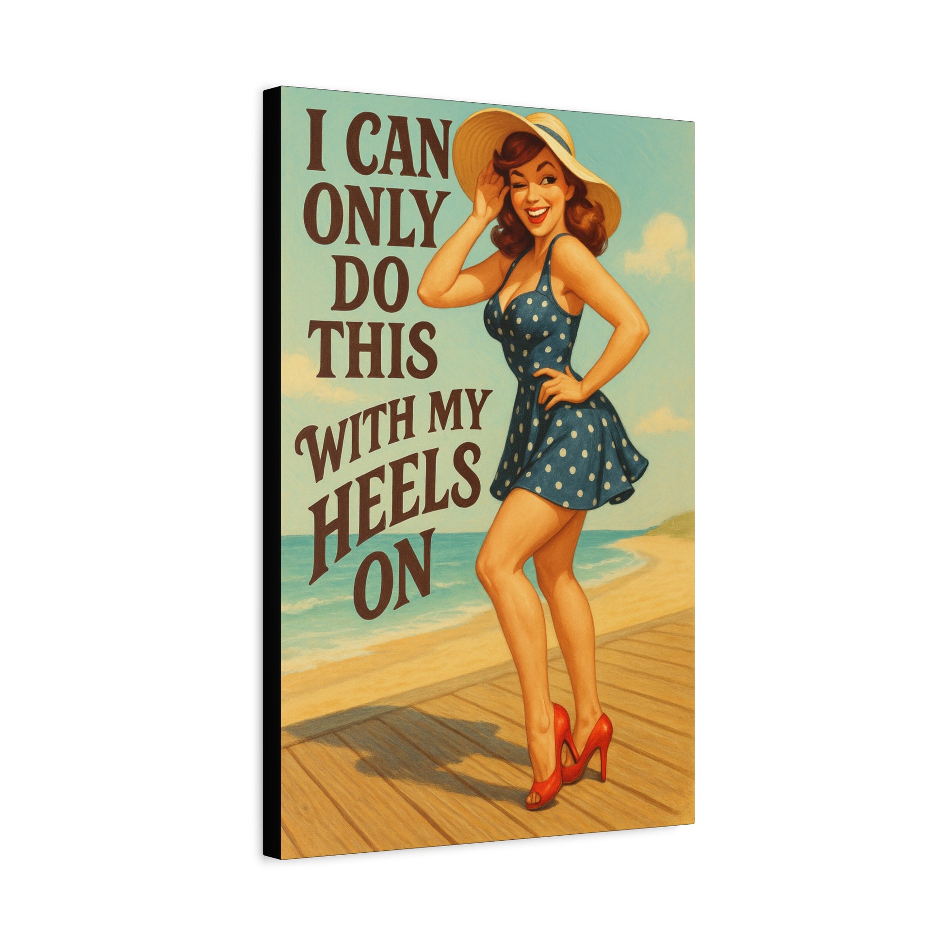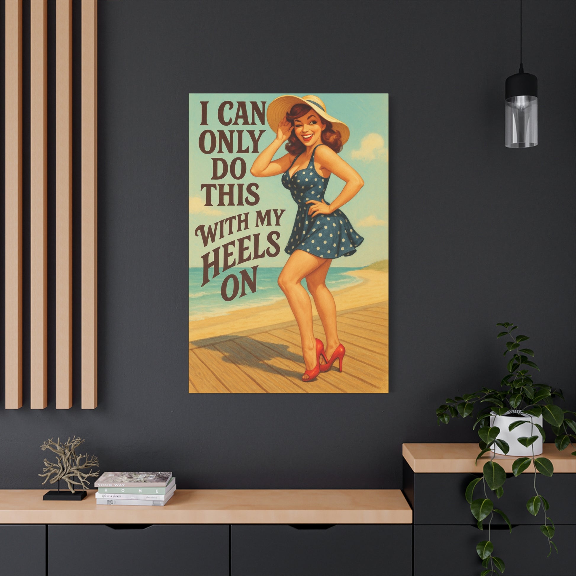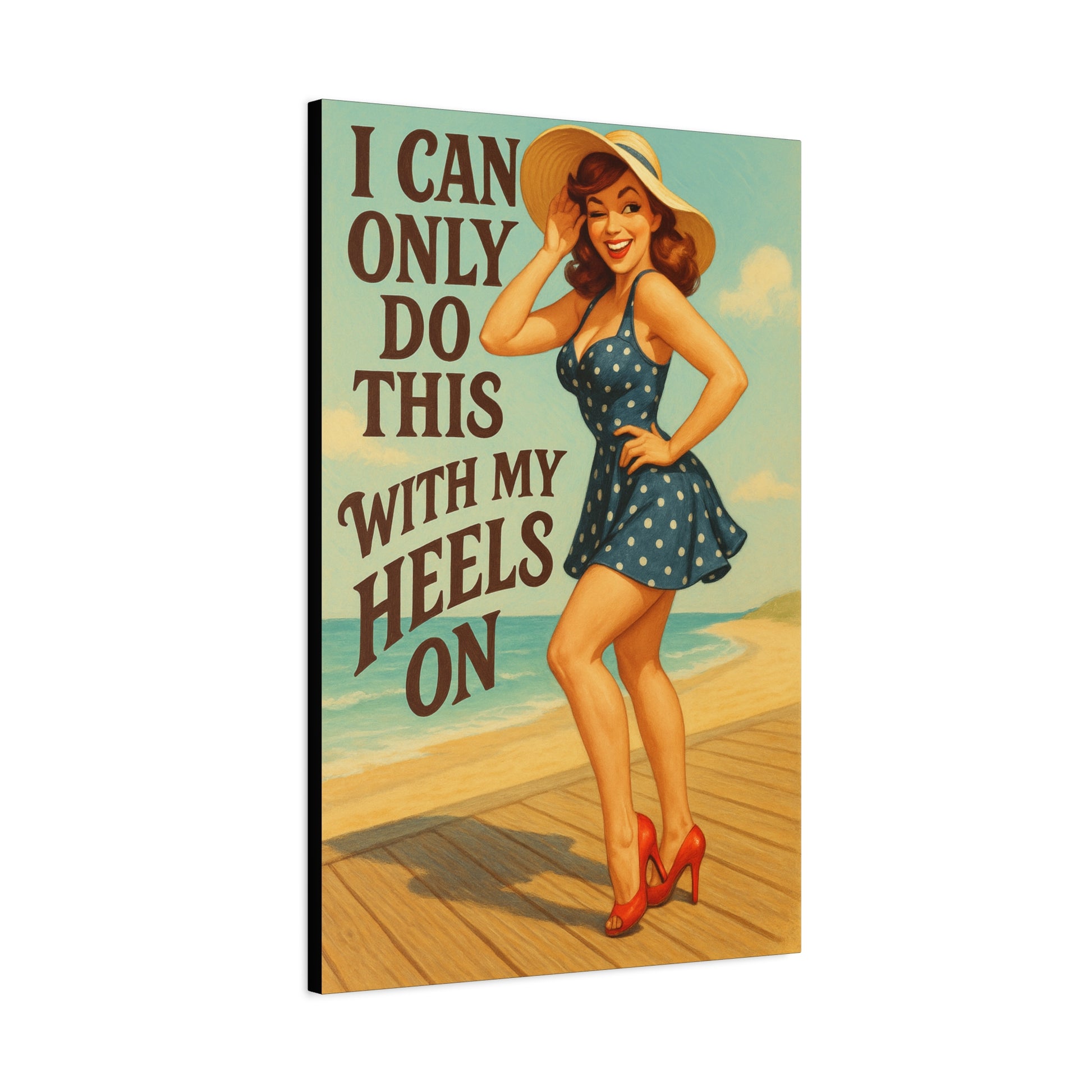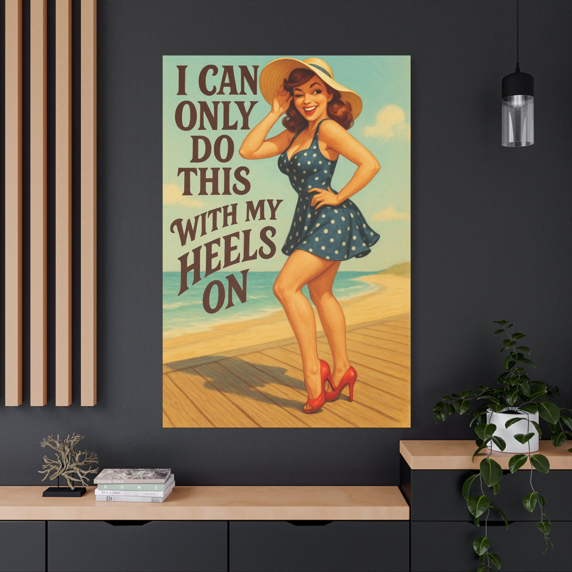 This humorous canvas print features a pin-up girl on the beach wearing heels with the saying 'I can only do this with my heels on.' Perfect for adding a playful and cheeky touch to any room decor. Ideal for those who appreciate vintage style and humor. Great for gifting on birthdays, bachelorette parties, or as a fun housewarming present.