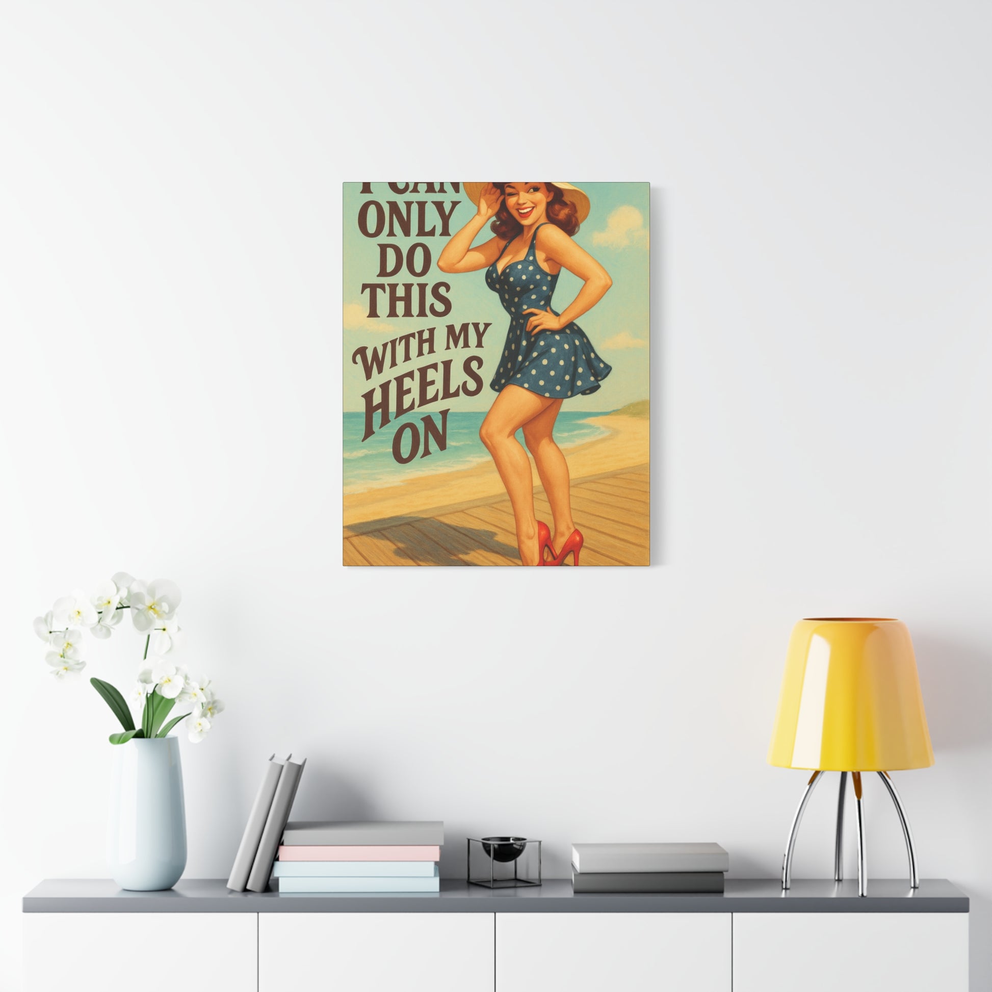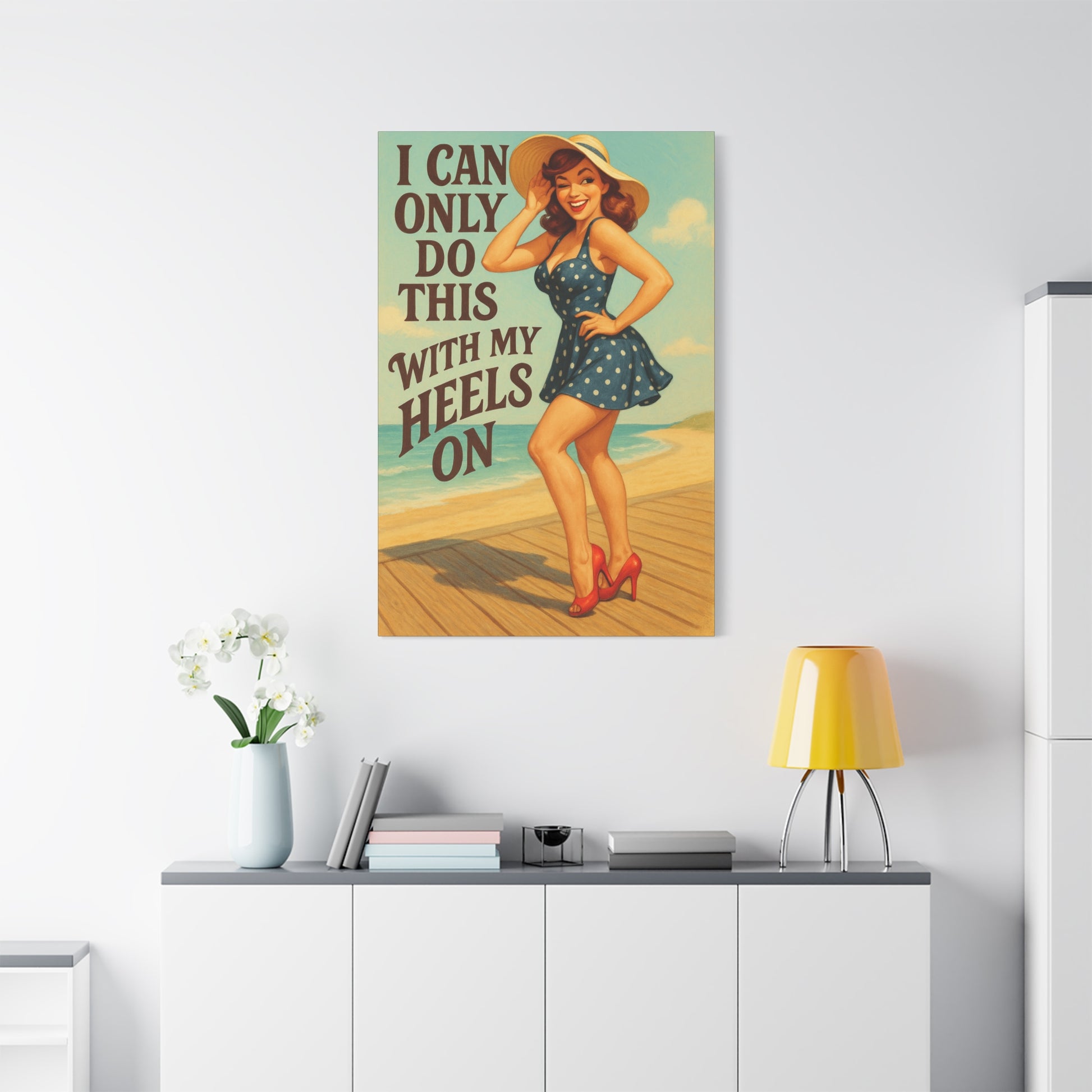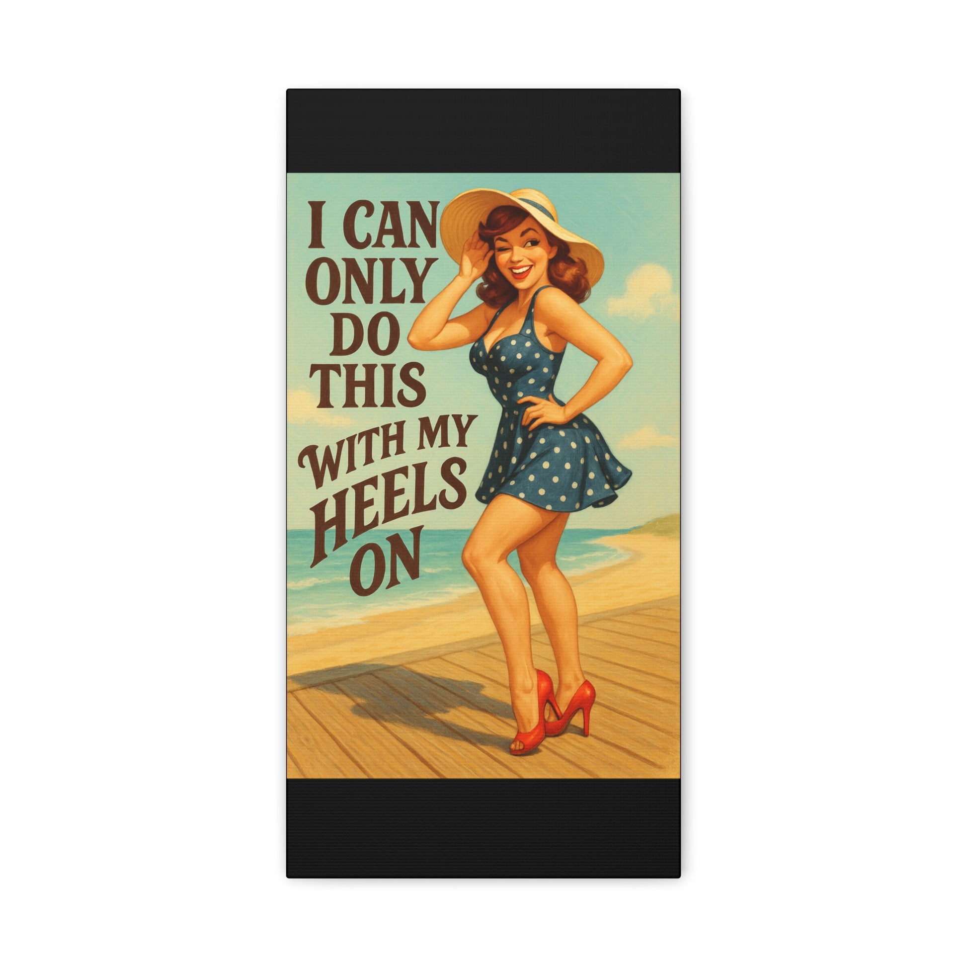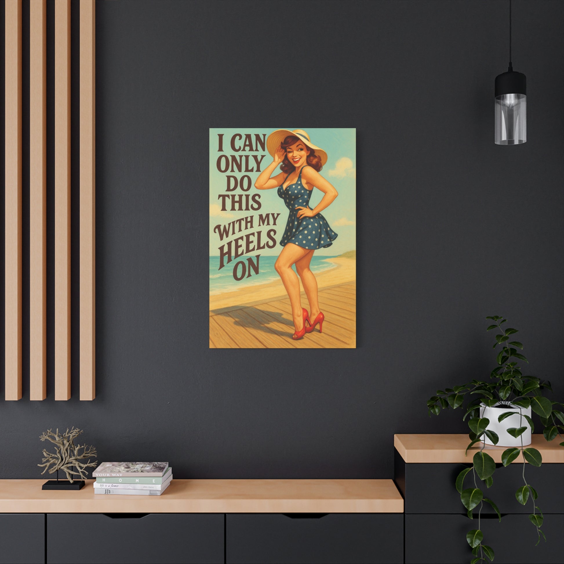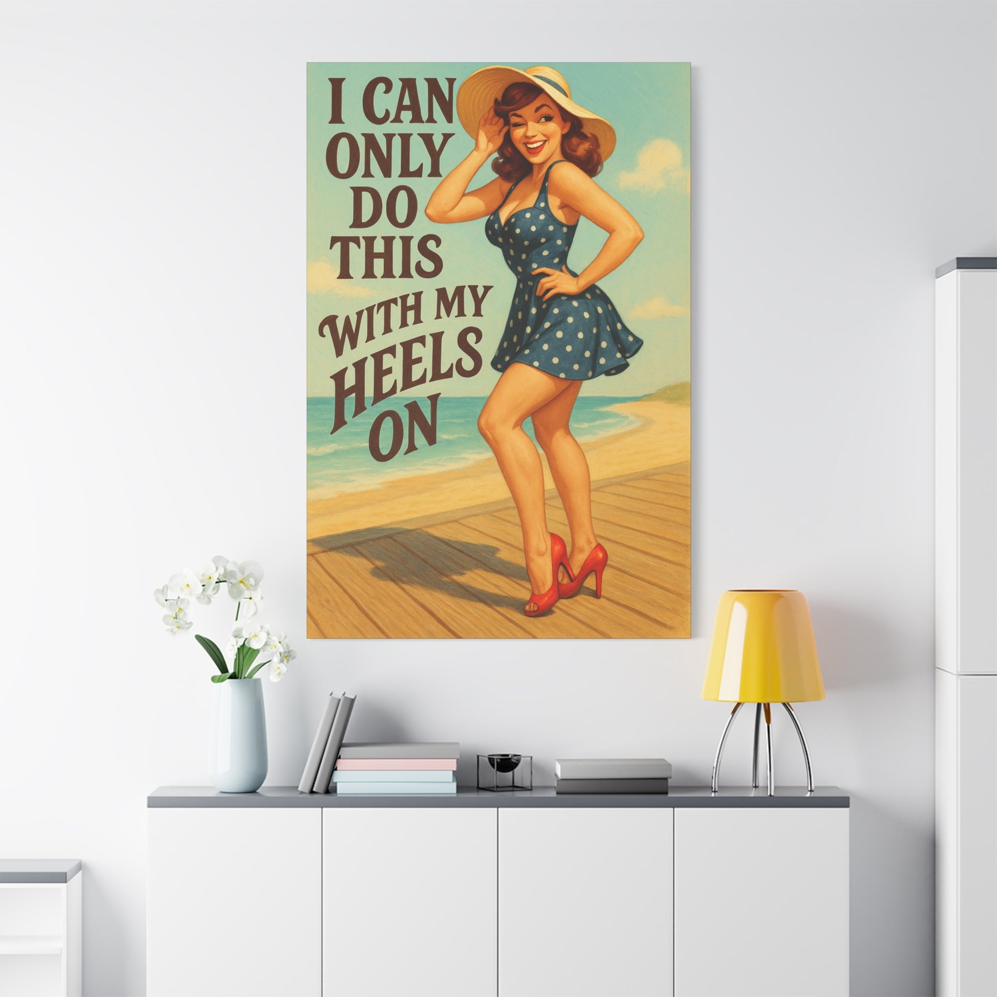 This humorous canvas print features a pin-up girl on the beach wearing heels with the saying 'I can only do this with my heels on.' Perfect for adding a playful and cheeky touch to any room decor. Ideal for those who appreciate vintage style and humor. Great for gifting on birthdays, bachelorette parties, or as a fun housewarming present.