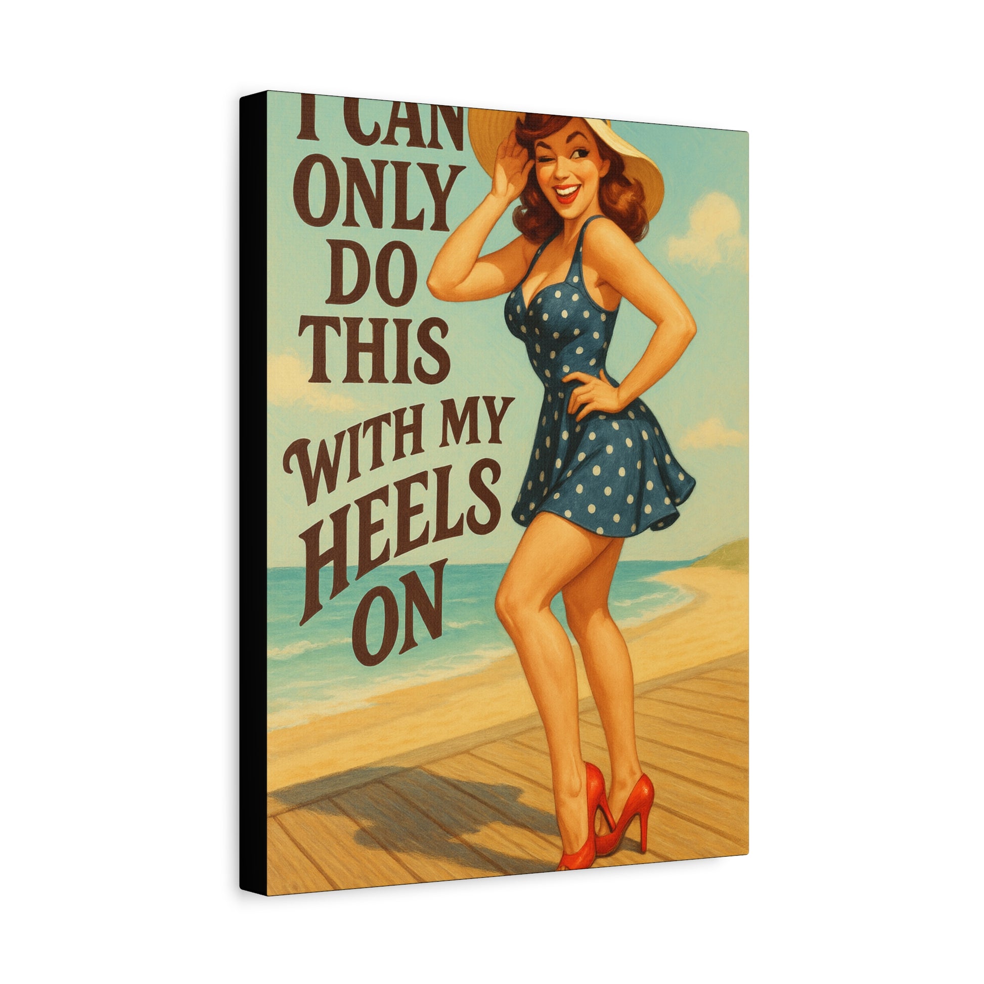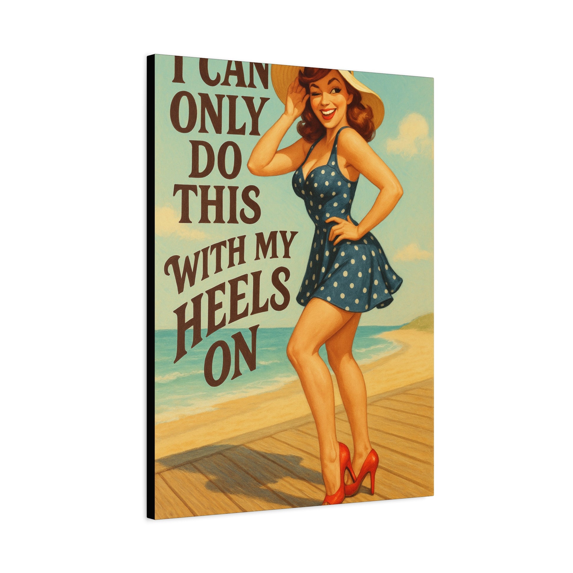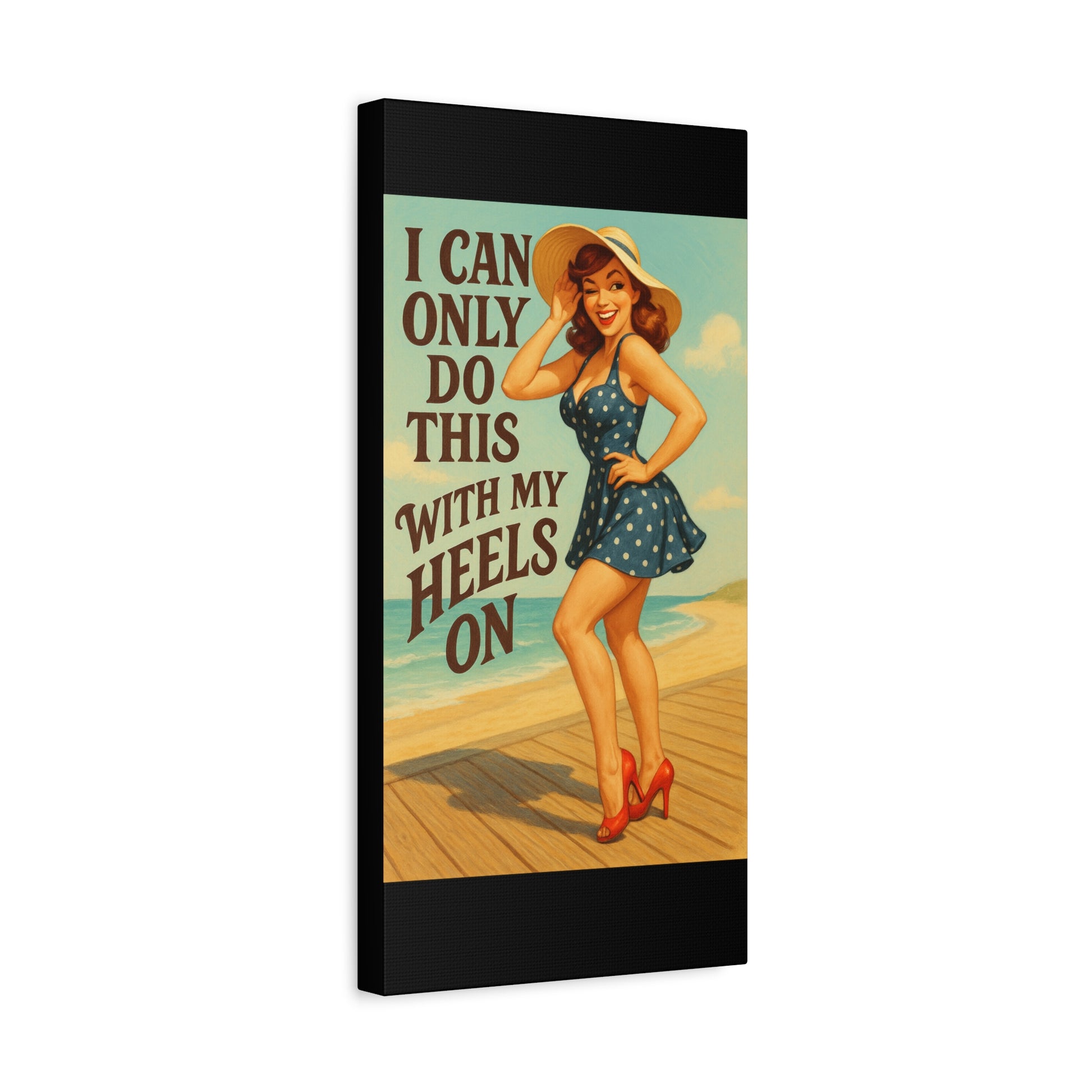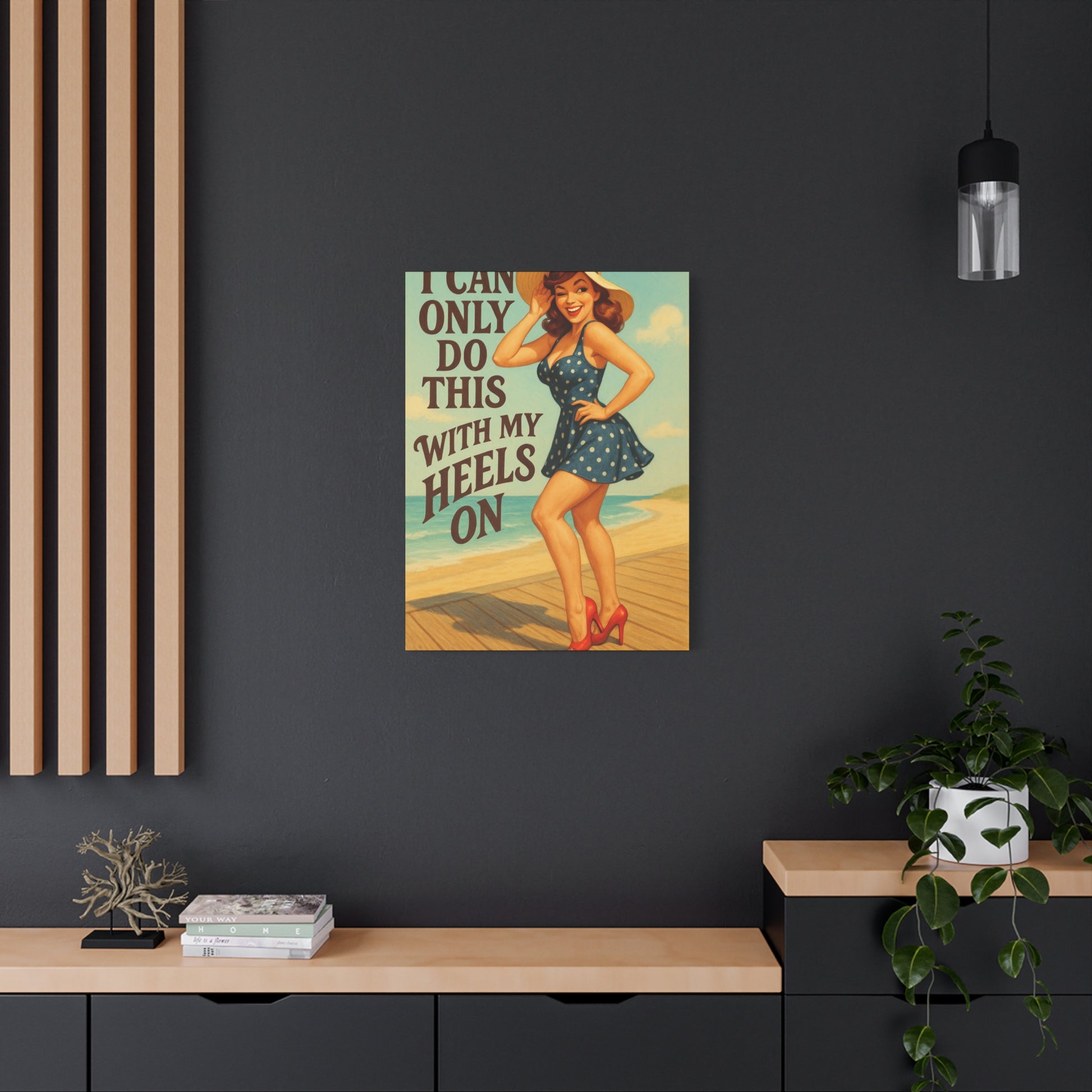 This humorous canvas print features a pin-up girl on the beach wearing heels with the saying 'I can only do this with my heels on.' Perfect for adding a playful and cheeky touch to any room decor. Ideal for those who appreciate vintage style and humor. Great for gifting on birthdays, bachelorette parties, or as a fun housewarming present.