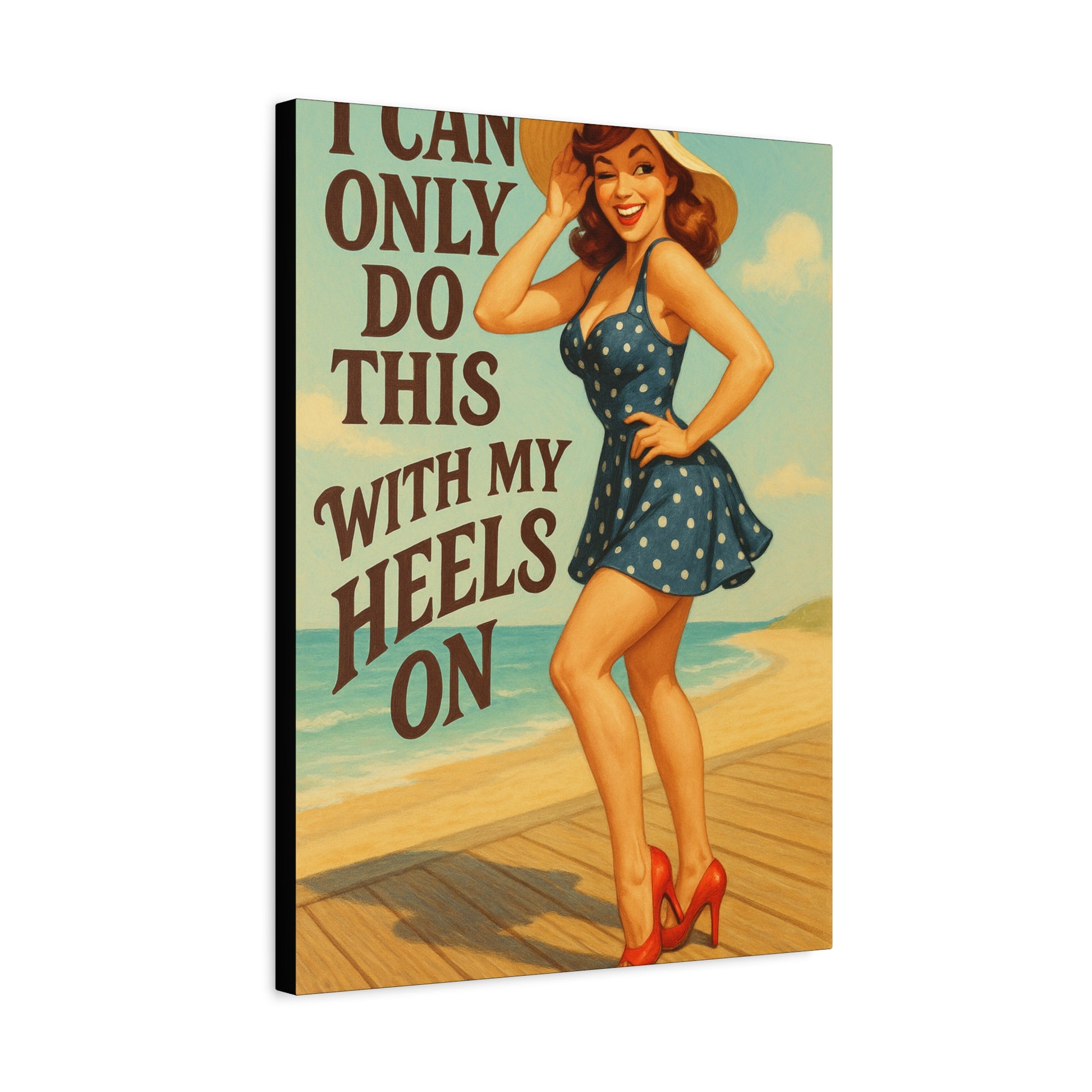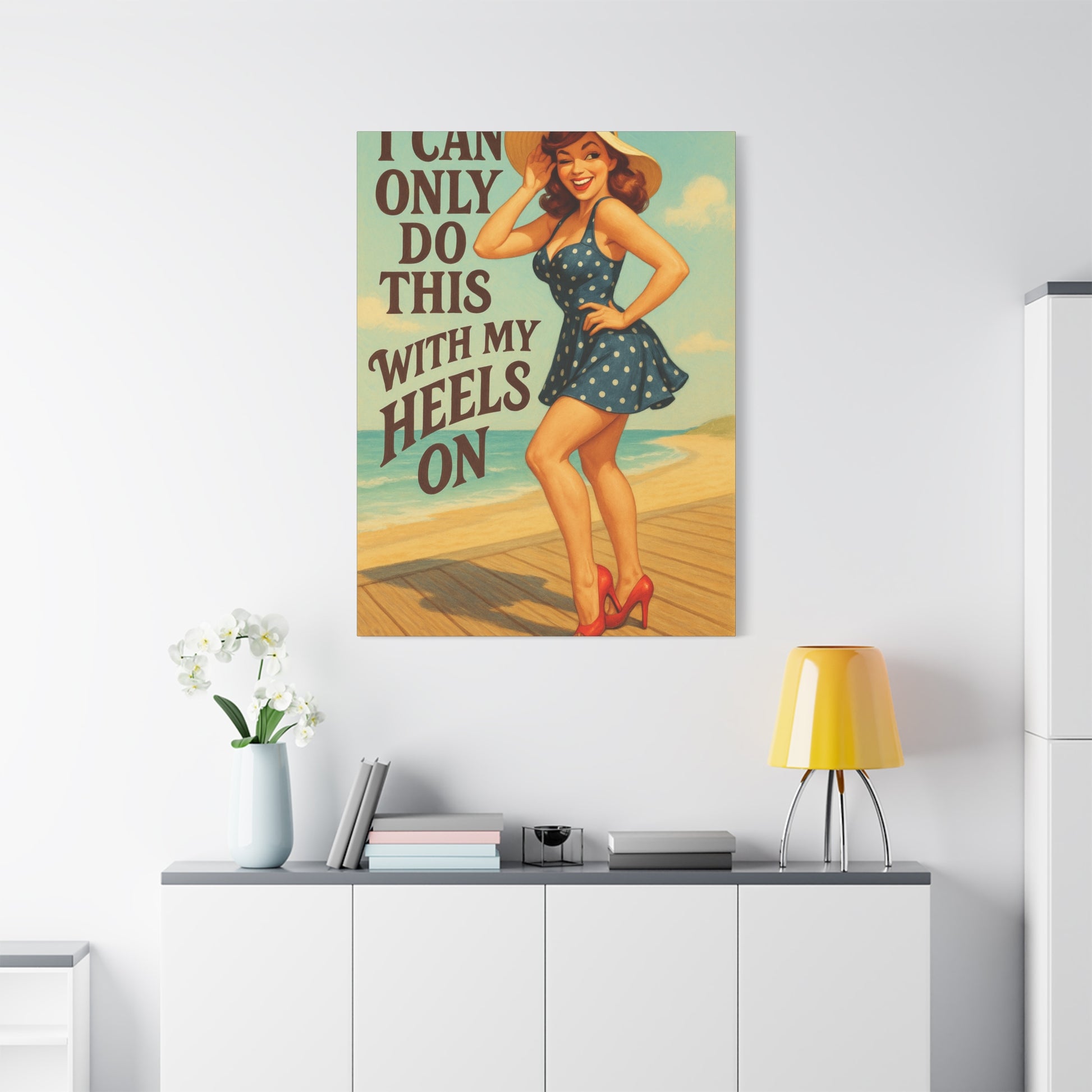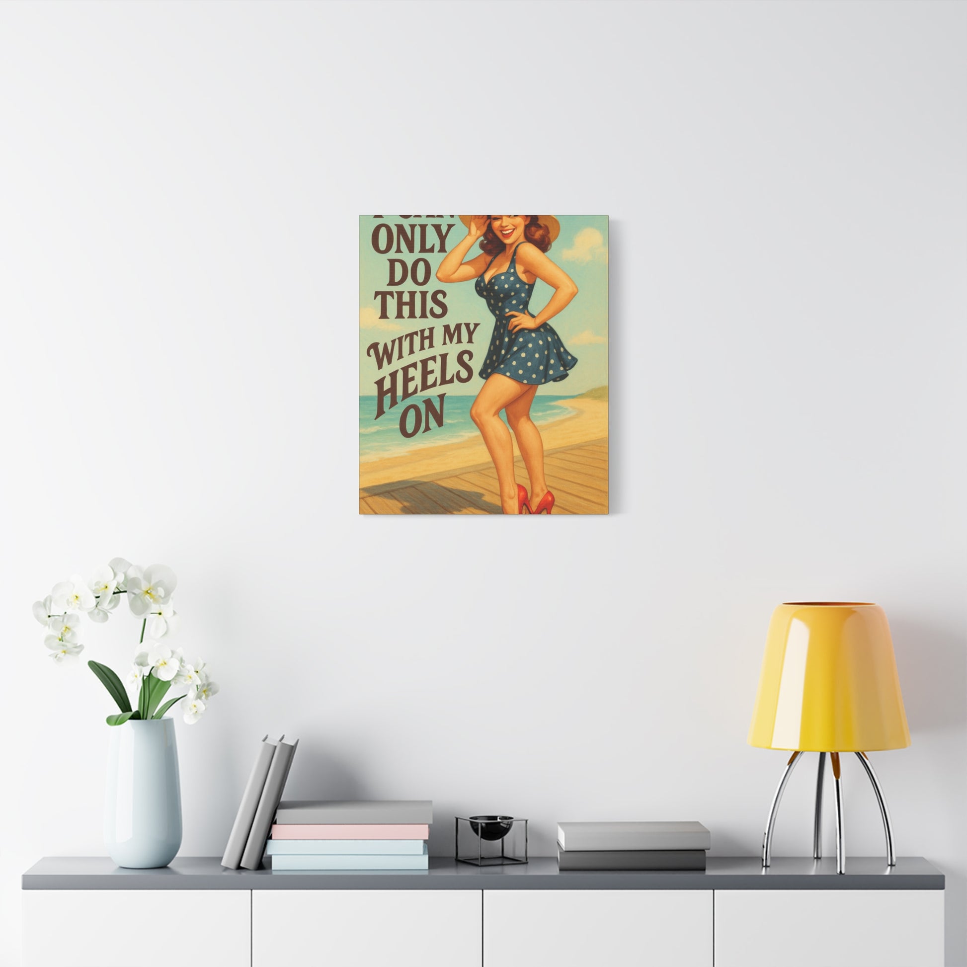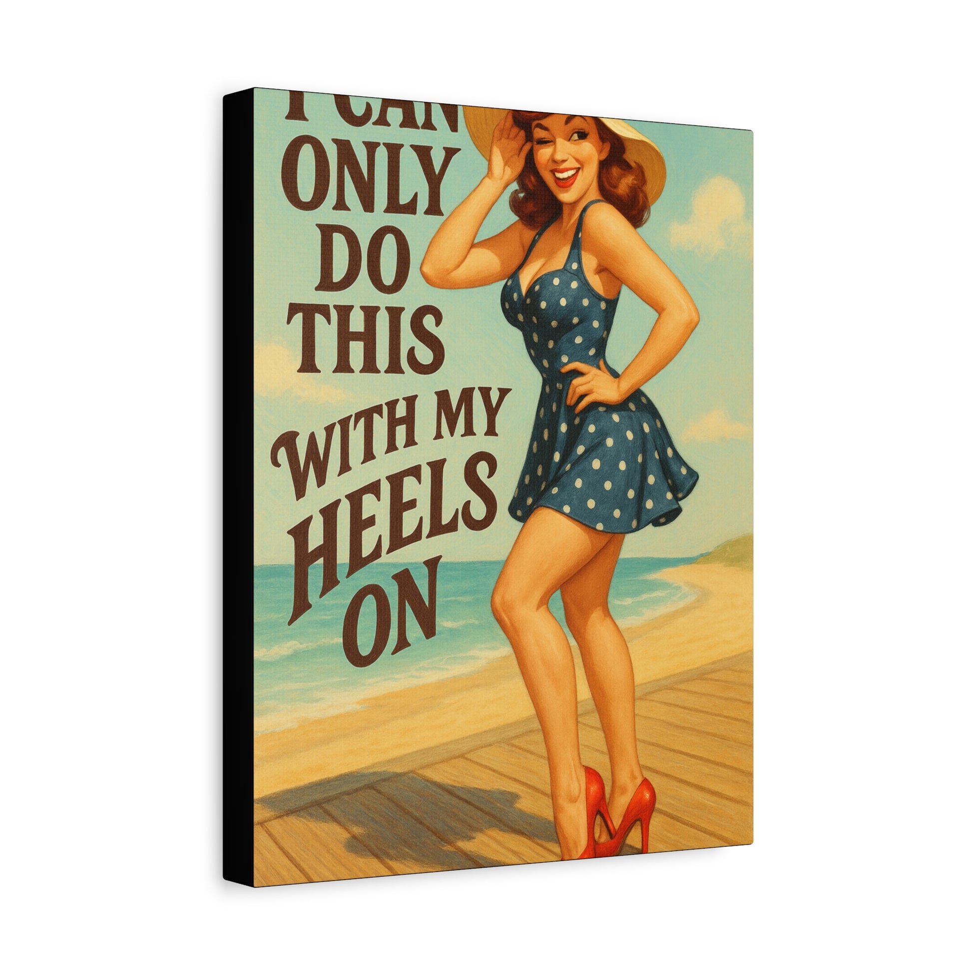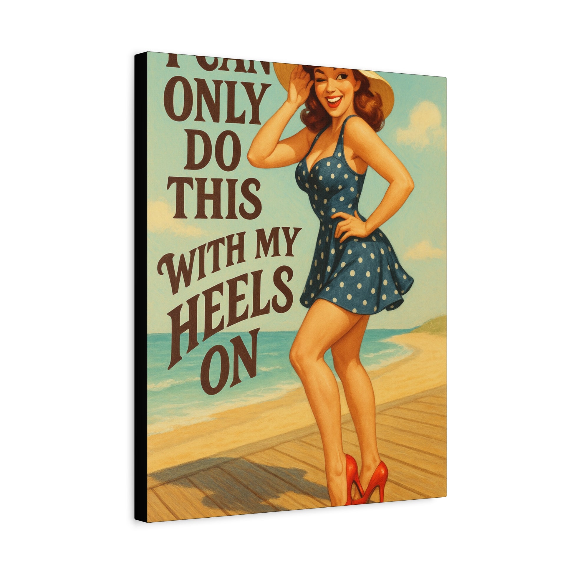 This humorous canvas print features a pin-up girl on the beach wearing heels with the saying 'I can only do this with my heels on.' Perfect for adding a playful and cheeky touch to any room decor. Ideal for those who appreciate vintage style and humor. Great for gifting on birthdays, bachelorette parties, or as a fun housewarming present.