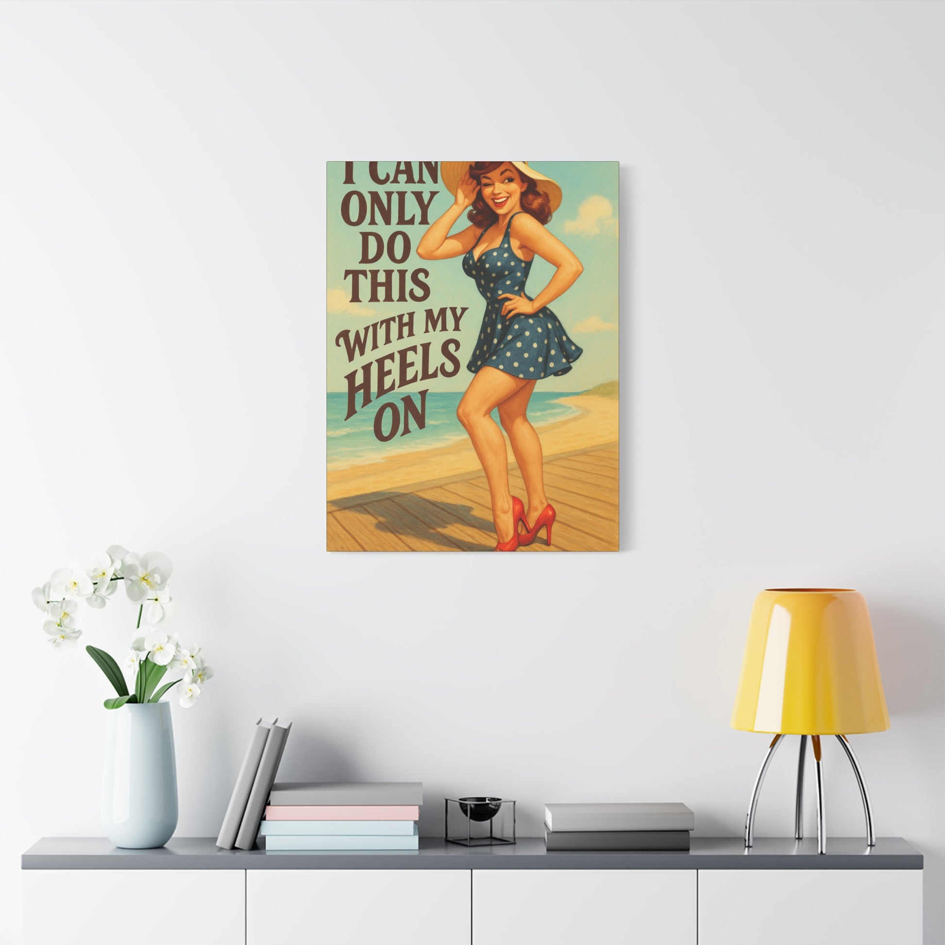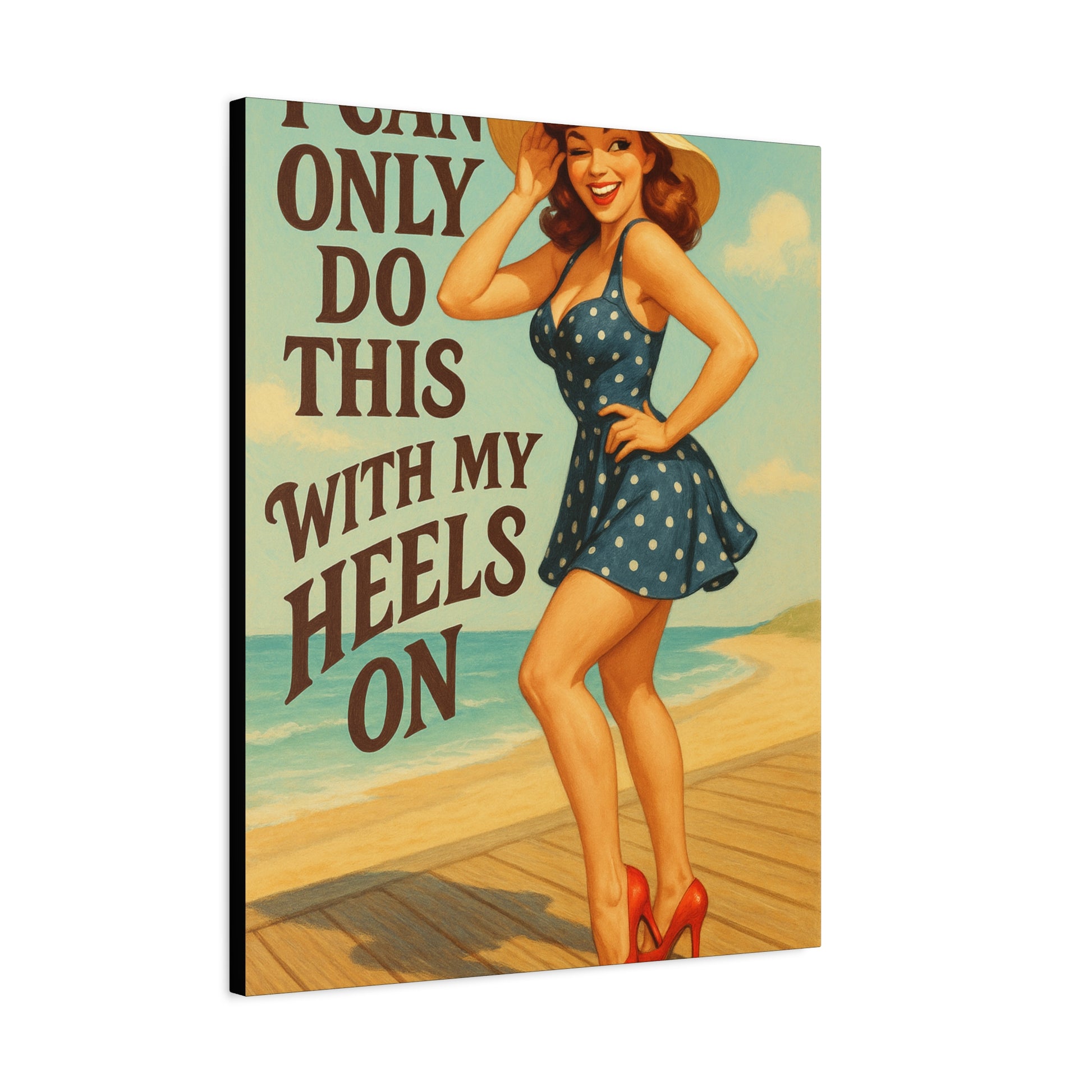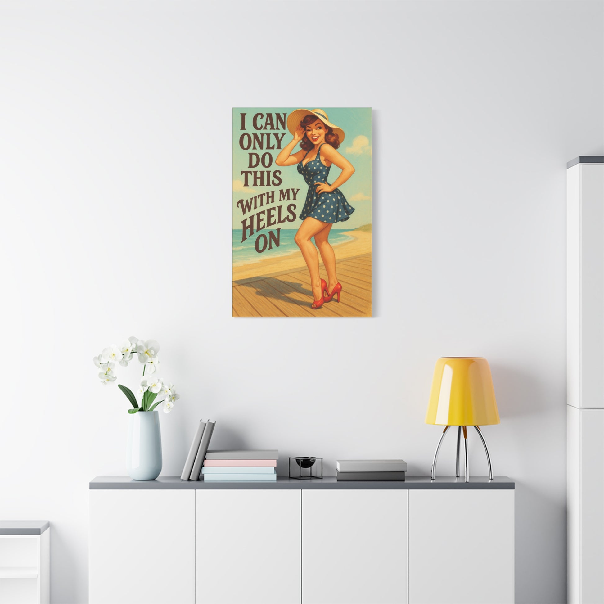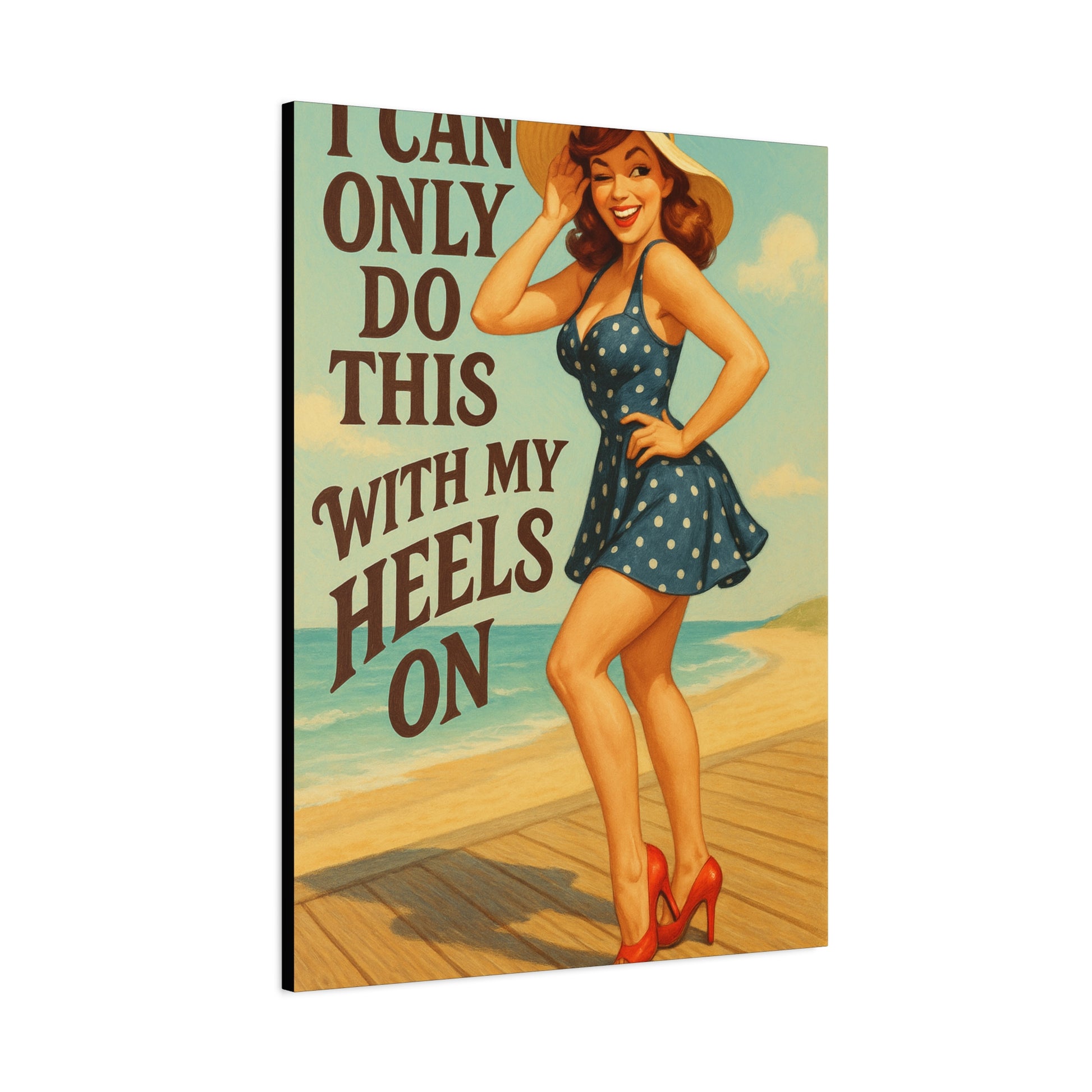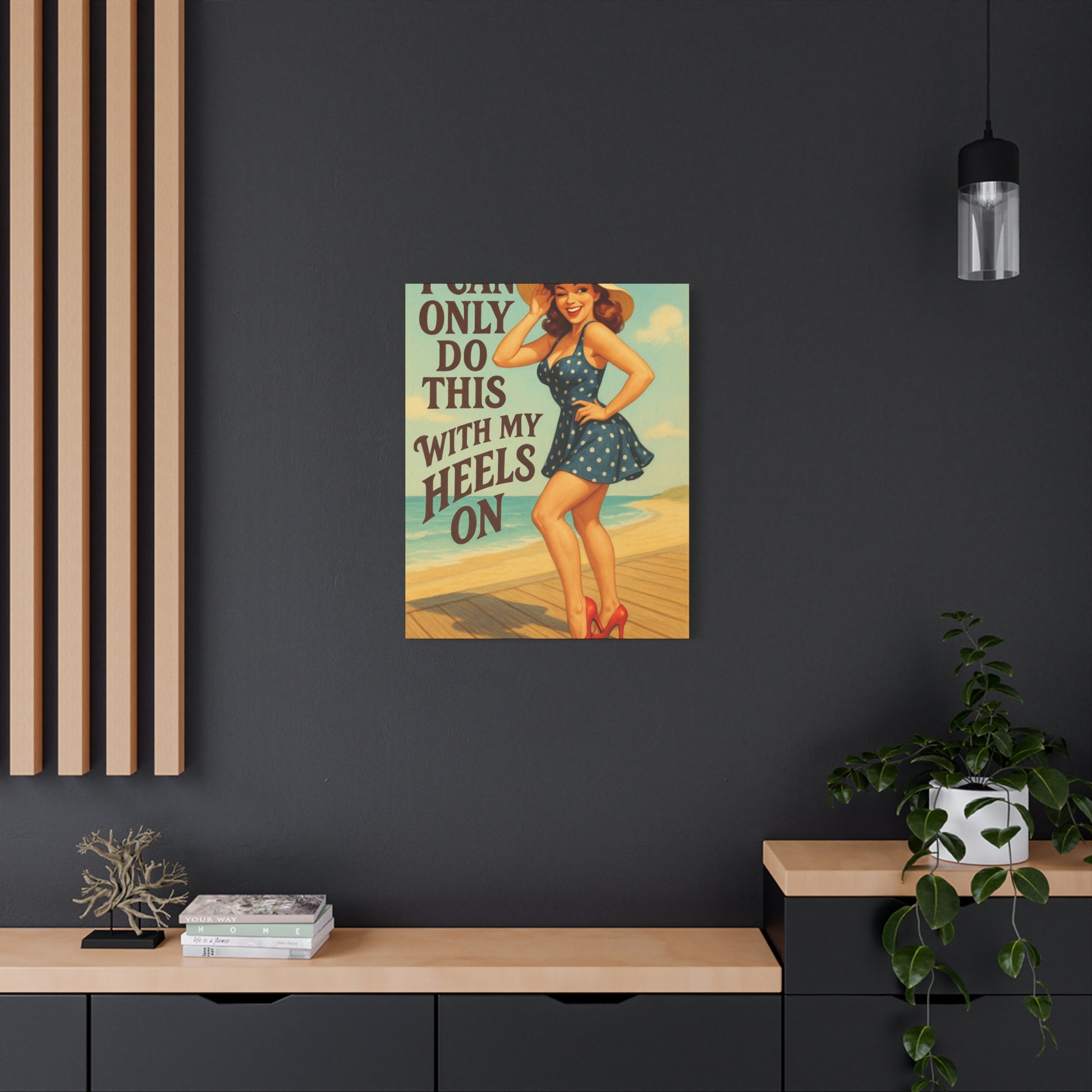 This humorous canvas print features a pin-up girl on the beach wearing heels with the saying 'I can only do this with my heels on.' Perfect for adding a playful and cheeky touch to any room decor. Ideal for those who appreciate vintage style and humor. Great for gifting on birthdays, bachelorette parties, or as a fun housewarming present.