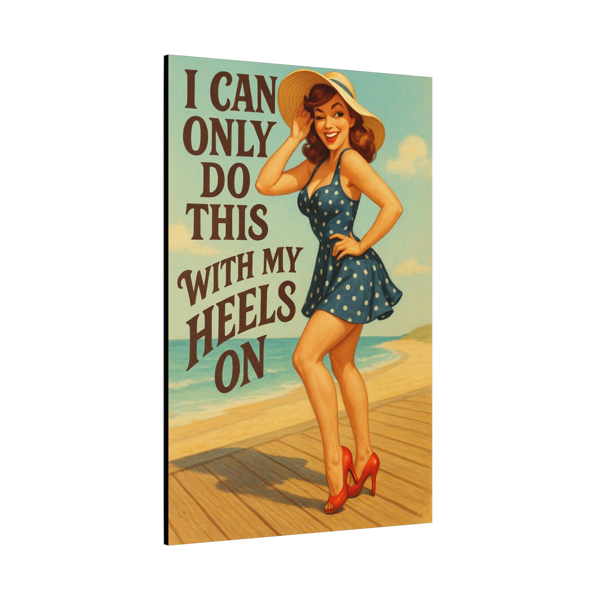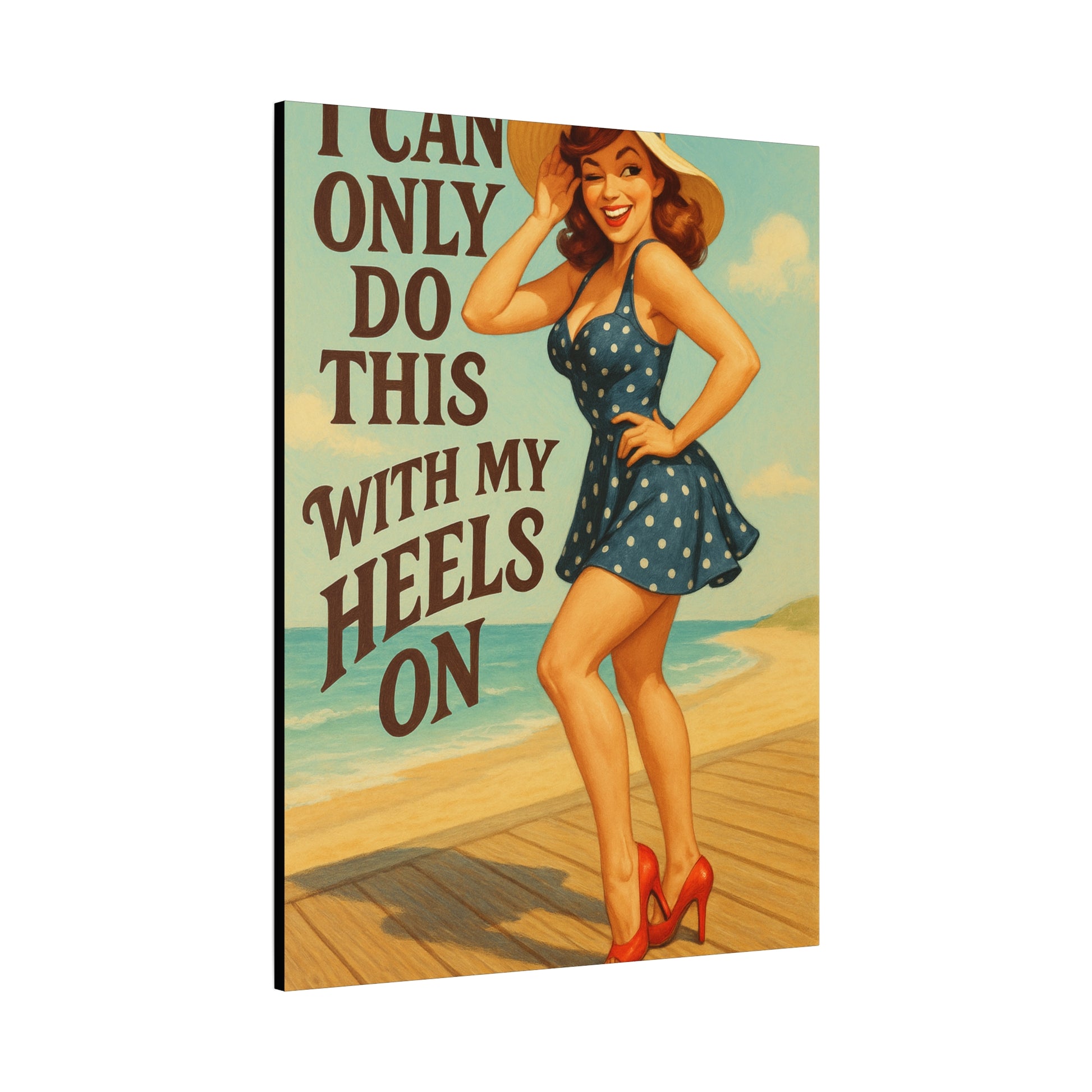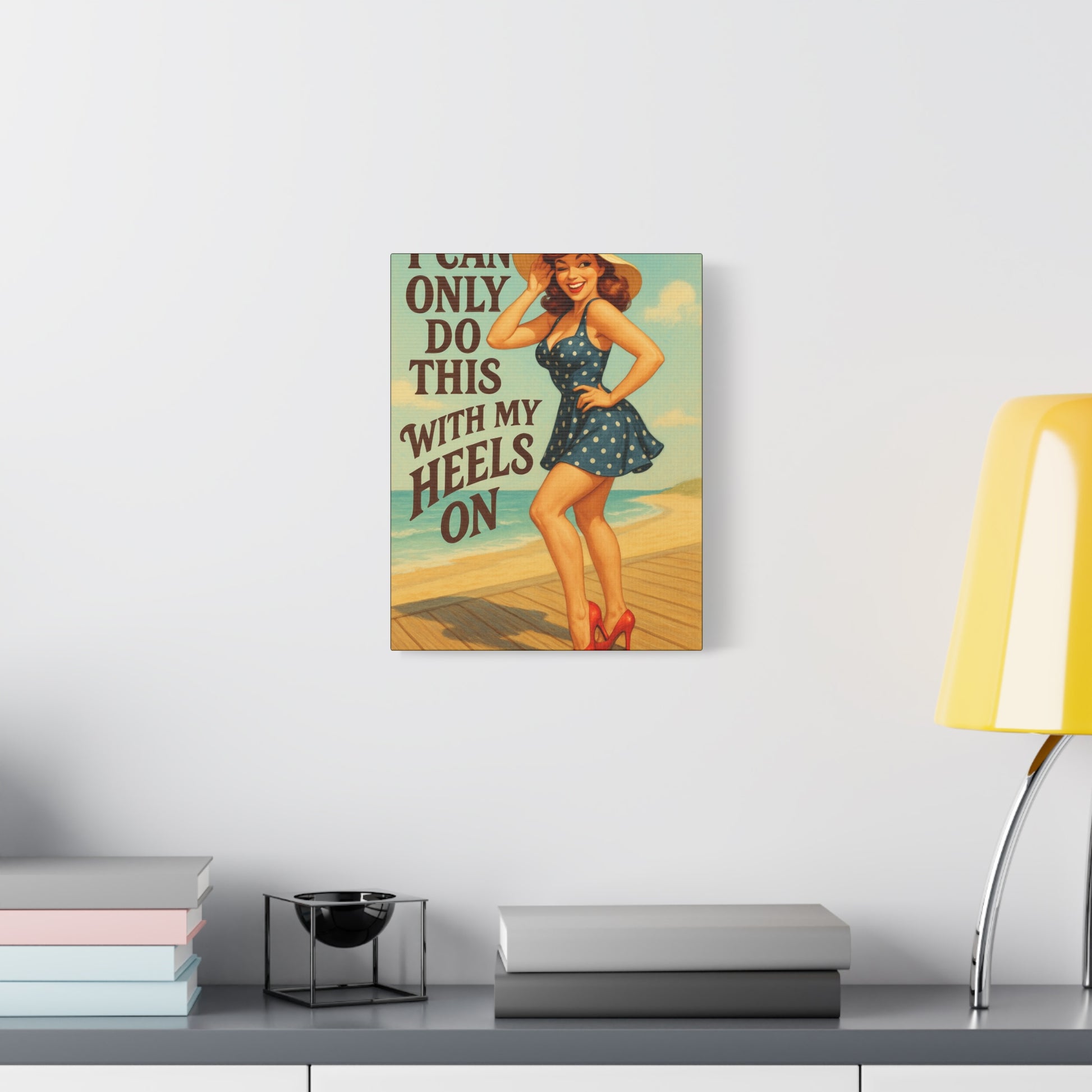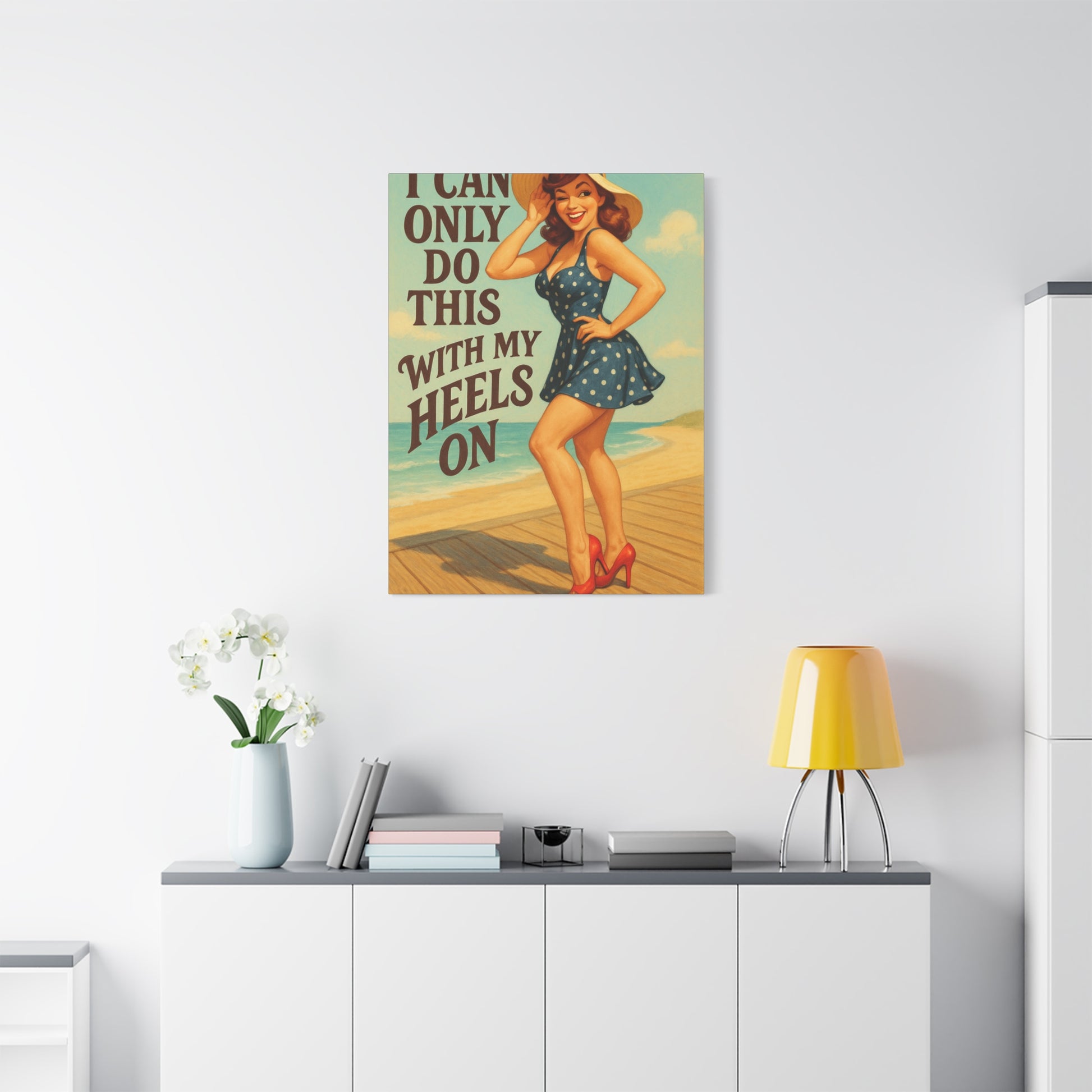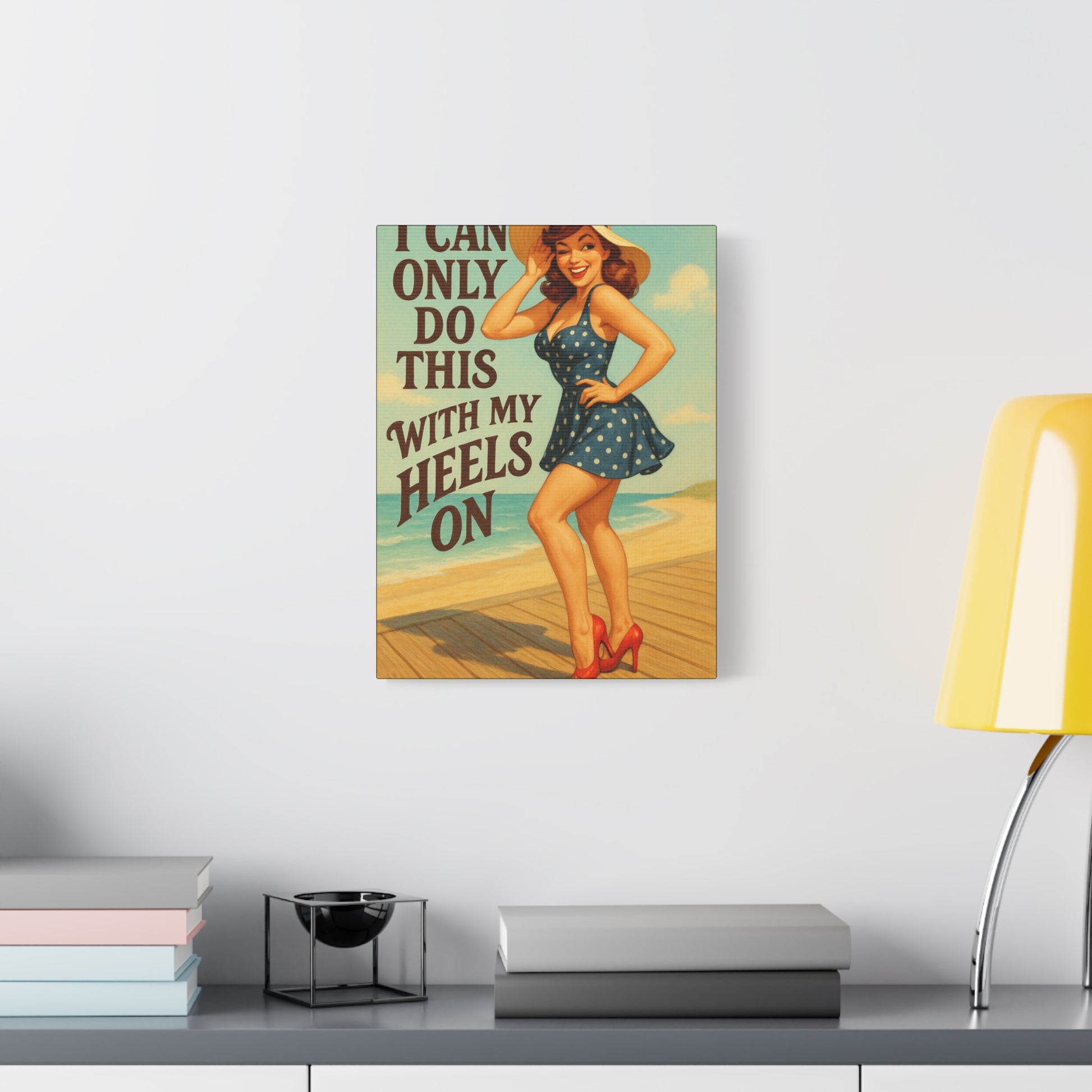 This humorous canvas print features a pin-up girl on the beach wearing heels with the saying 'I can only do this with my heels on.' Perfect for adding a playful and cheeky touch to any room decor. Ideal for those who appreciate vintage style and humor. Great for gifting on birthdays, bachelorette parties, or as a fun housewarming present.