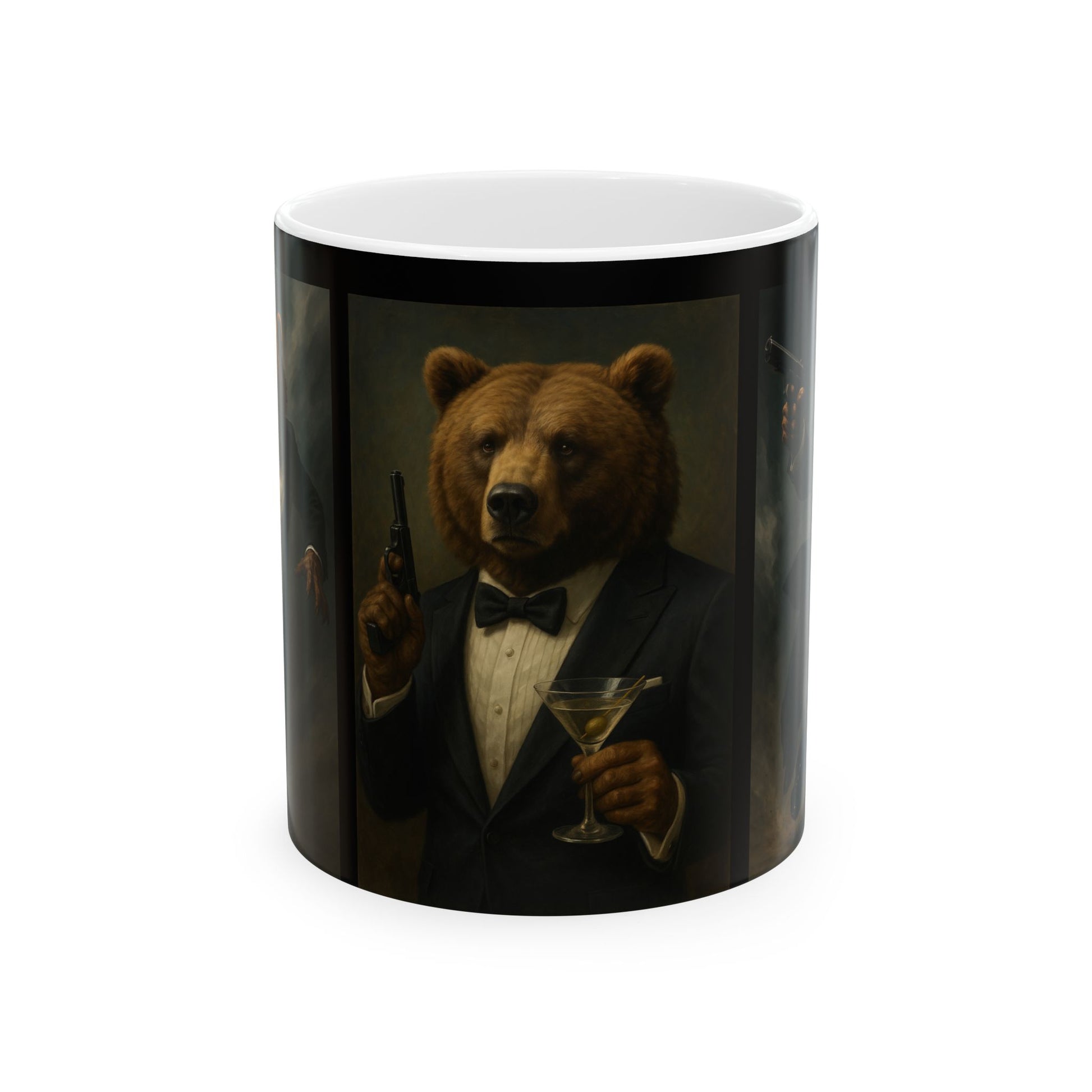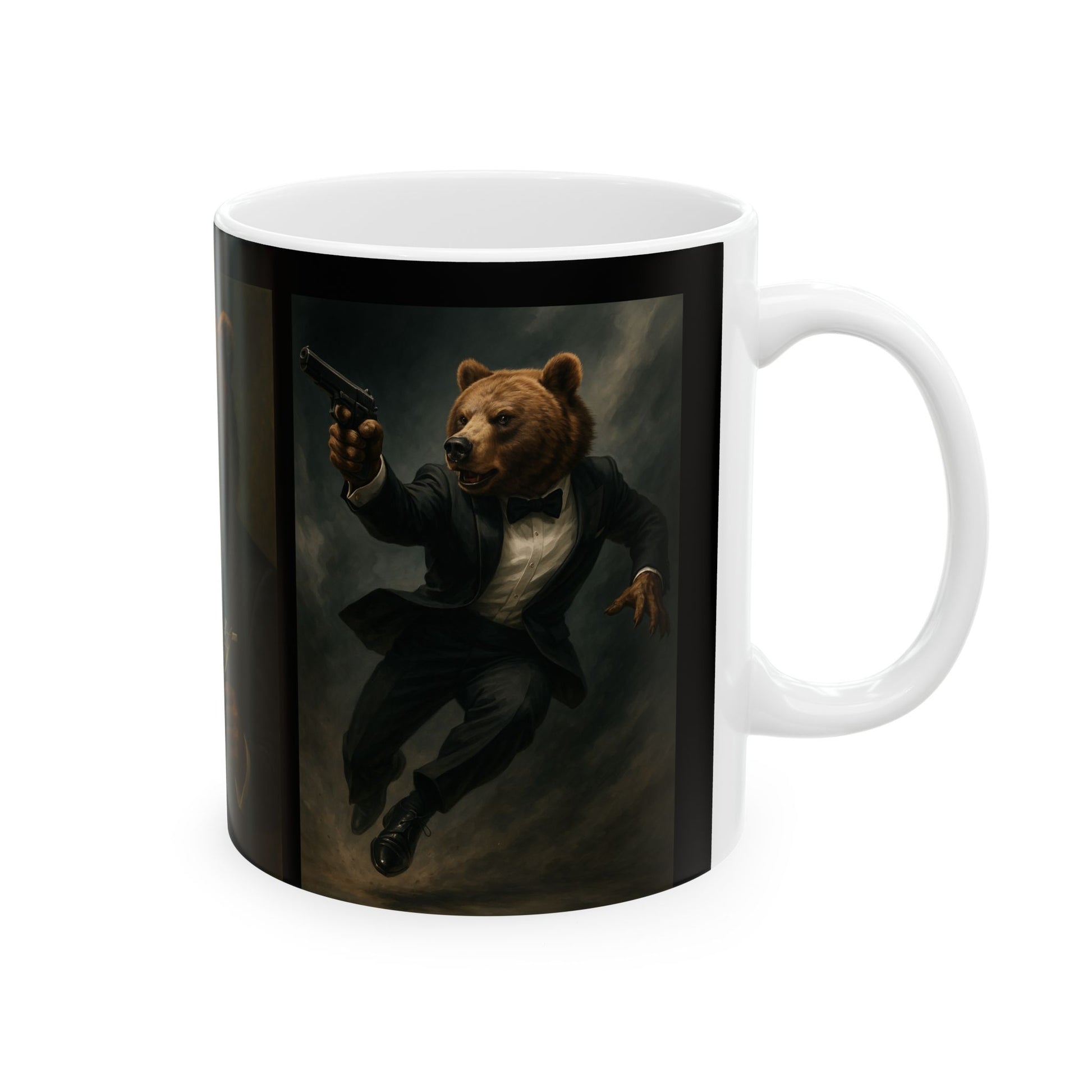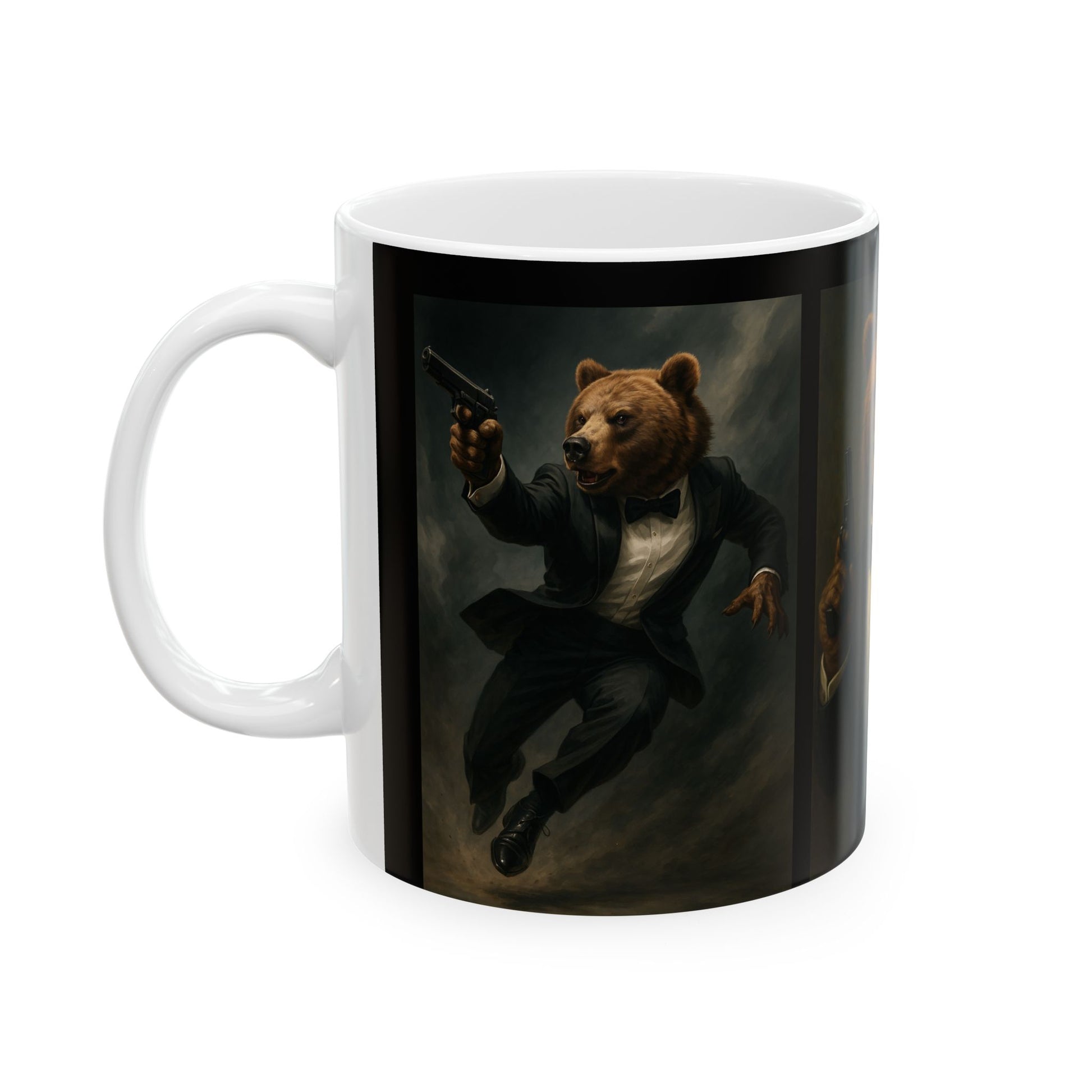 Artistic Spy Bear Portrait Ceramic Mug, perfect for coffee lovers and bear enthusiasts. This unique mug adds a touch of James Bond inspiration to your home or office decor. Ideal as a gift for bear lovers or anyone who appreciates unique art. Suitable for daily use or special occasions like birthdays or holidays.