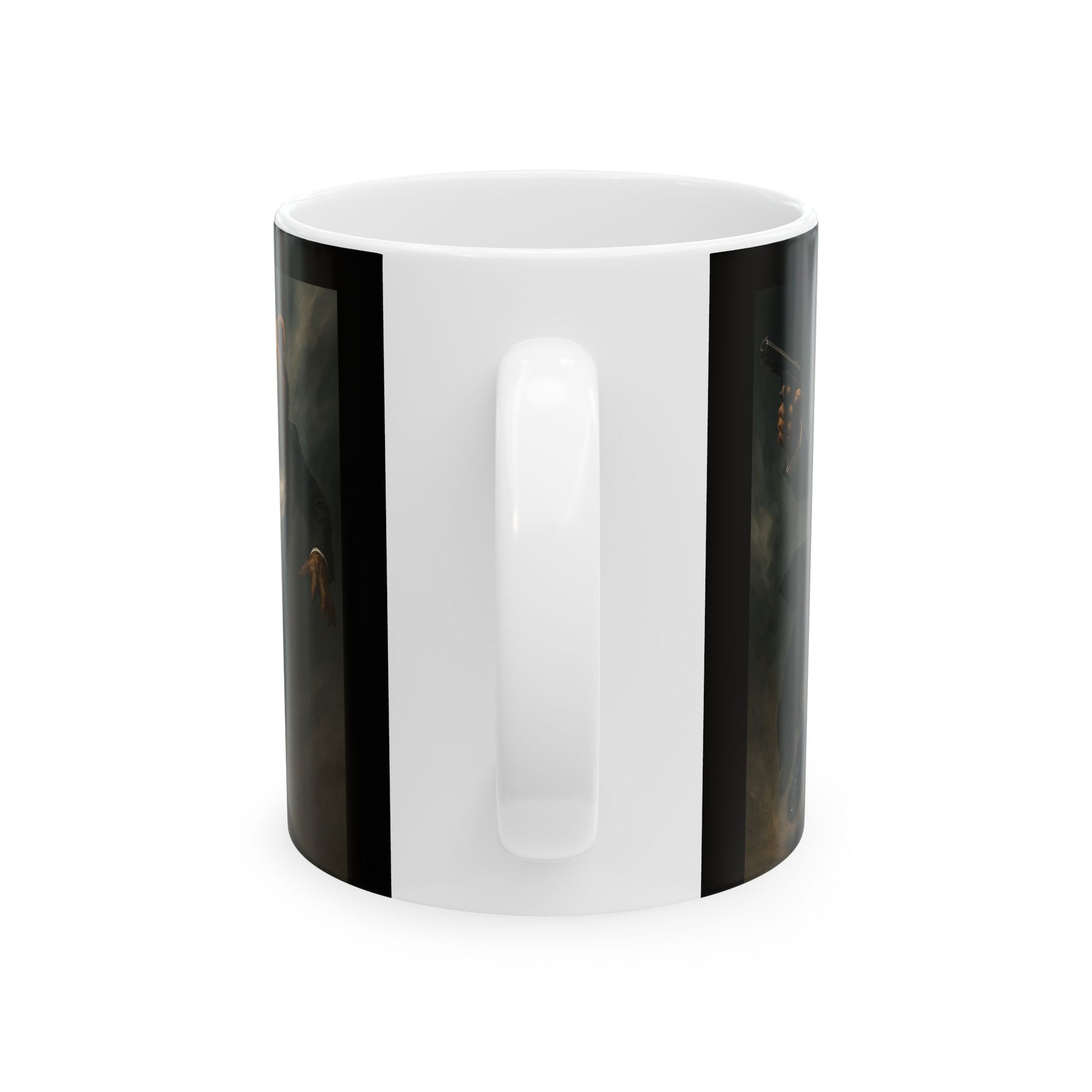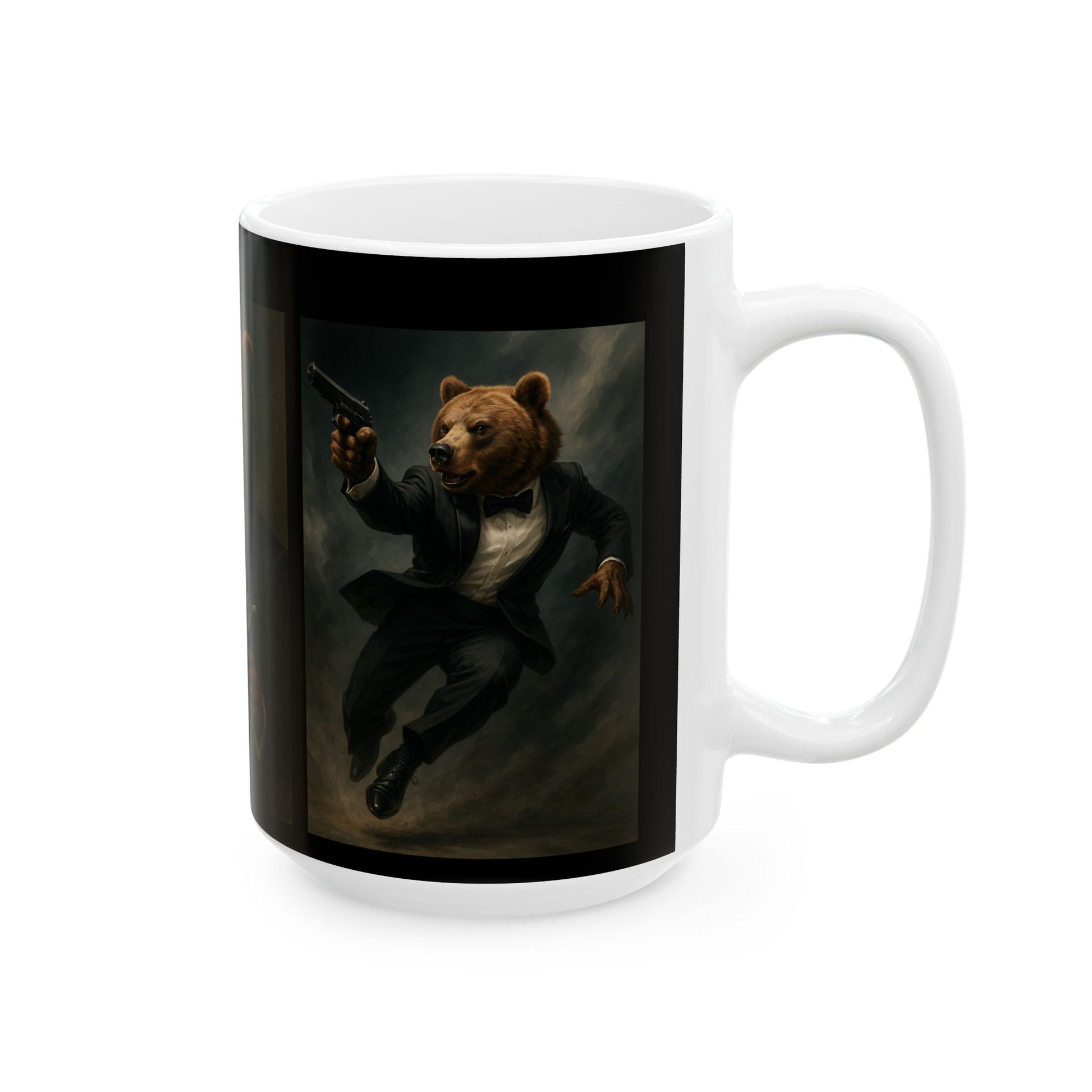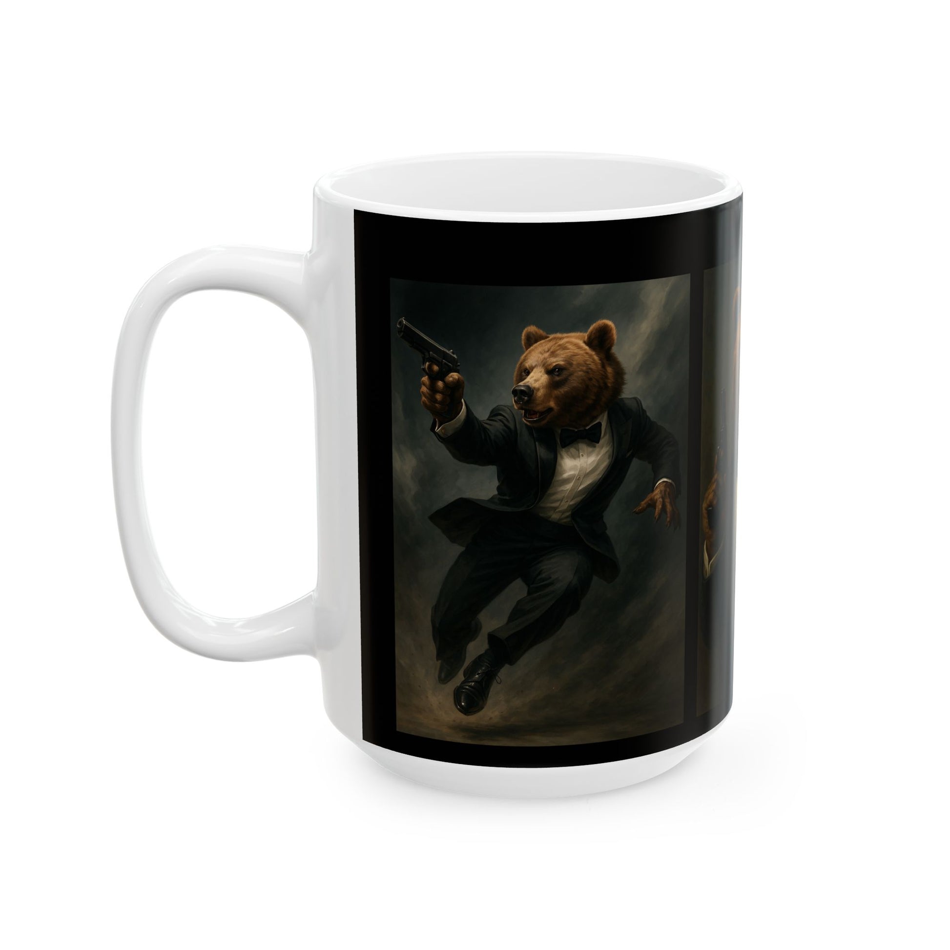 Artistic Spy Bear Portrait Ceramic Mug, perfect for coffee lovers and bear enthusiasts. This unique mug adds a touch of James Bond inspiration to your home or office decor. Ideal as a gift for bear lovers or anyone who appreciates unique art. Suitable for daily use or special occasions like birthdays or holidays.